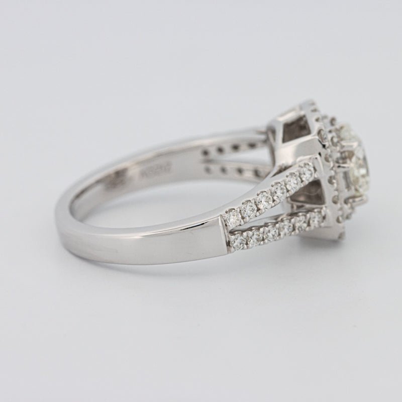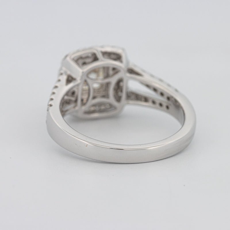 Set in 18K white gold (5.00g) with 1.45 ct F/VS accents along the halos and shoulders, it balances timeless romance with high‑impact sparkle.