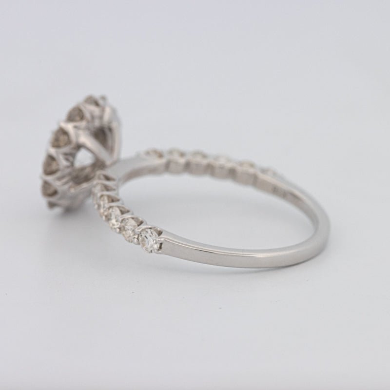 Set in 18K white gold (3.00g) with 1.25 ct F/VS accents along the halo and shoulders, it balances timeless elegance with high‑impact sparkle.