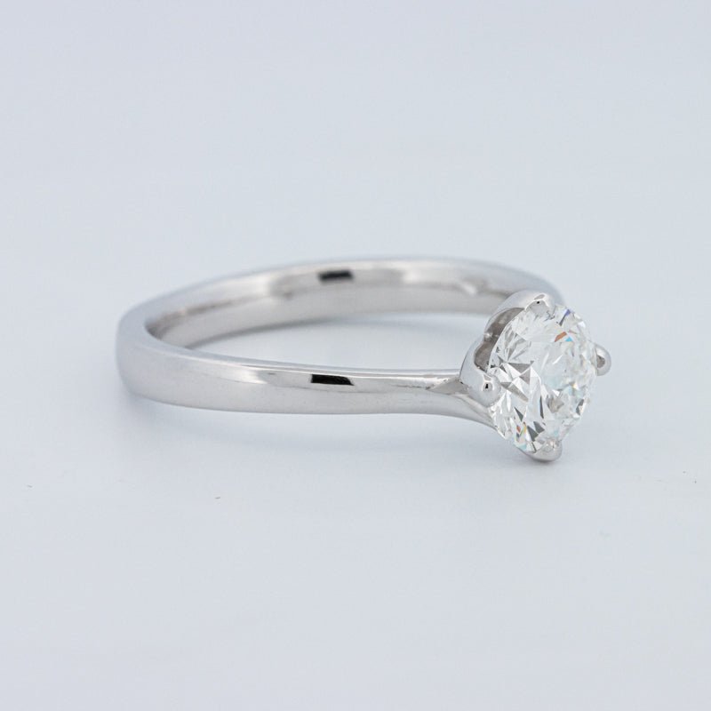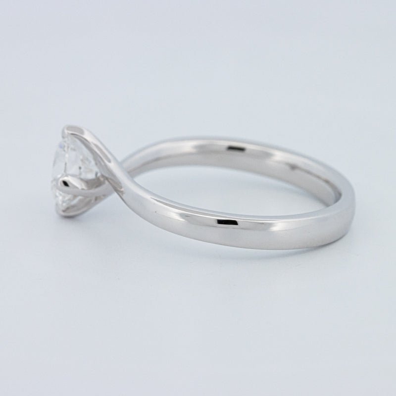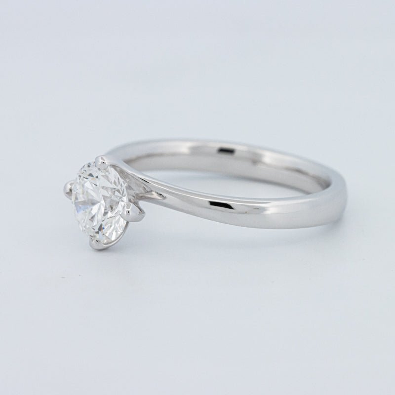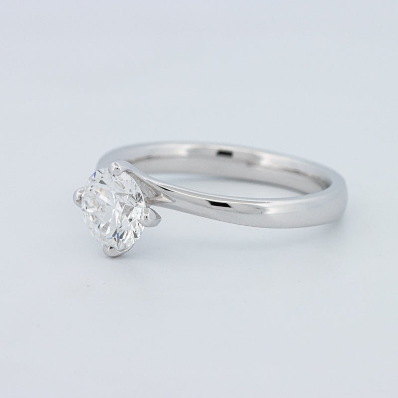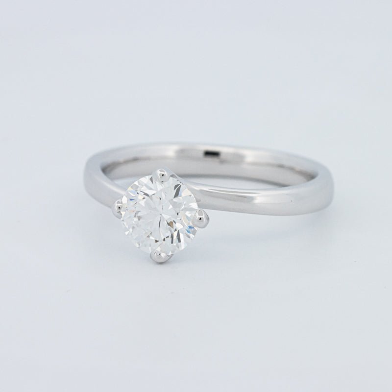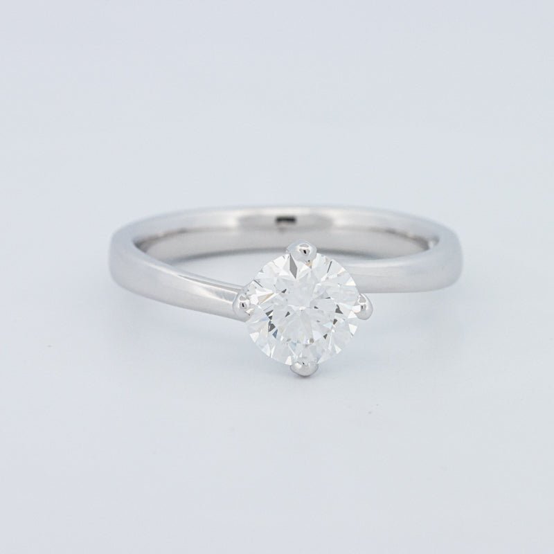 A 1.06 ct E/VVS2 lab‑grown round brilliant sits in a refined twist‑band solitaire, offering crisp white fire and a clean, high‑clarity face‑up.