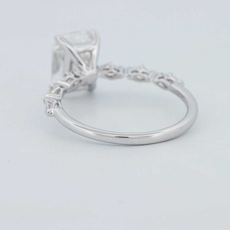A 2.10 ct F/VS1 lab‑grown cushion cut crowns the “Kaylee” pavé solitaire, pairing soft square contours with brilliant facet fire for a modern romantic look.