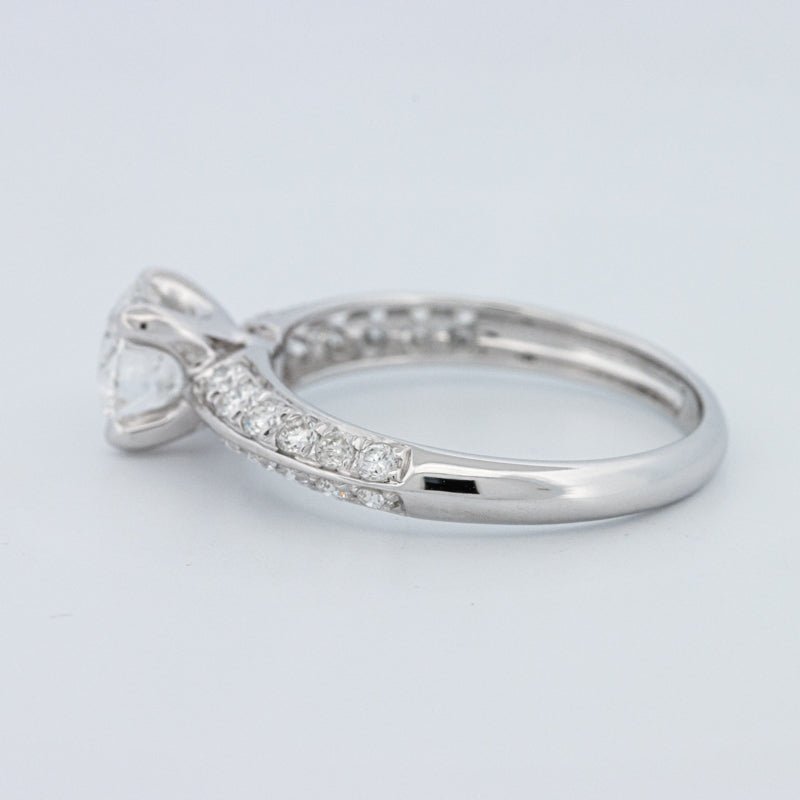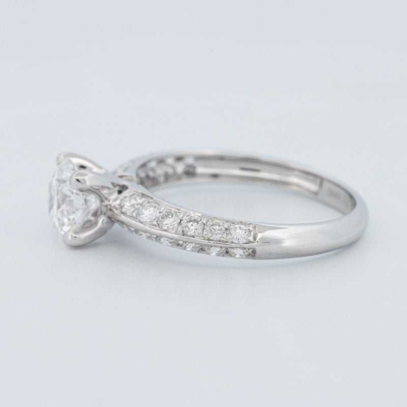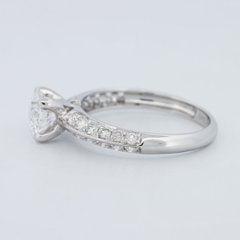 A 1.05 ct lab‑grown round brilliant in E/VVS2 anchors this pavé solitaire, offering crisp white fire and a refined, high‑clarity presence.