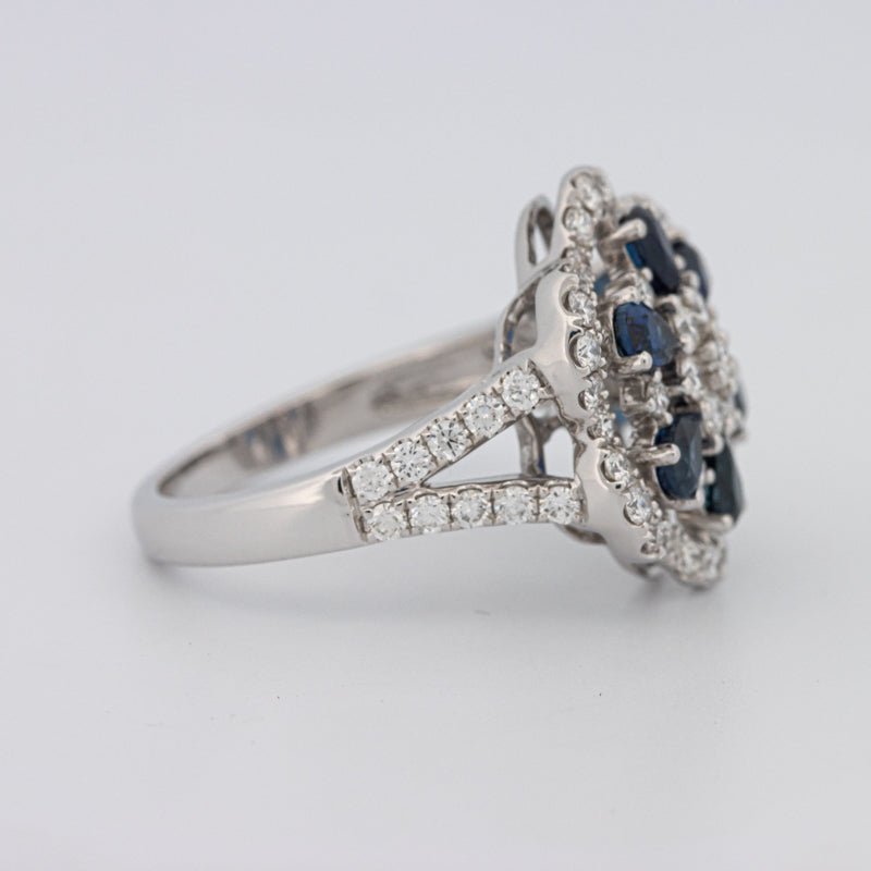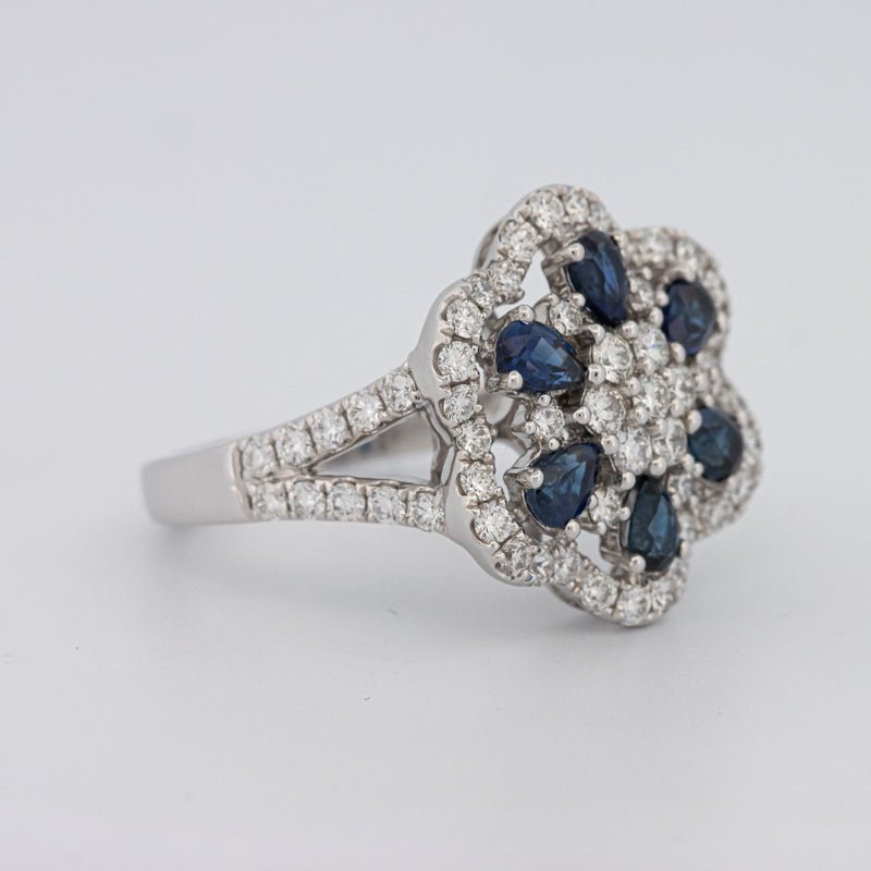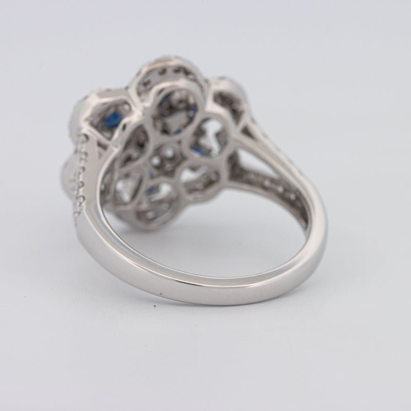 Ein üppiges Bouquet aus 3.50 ct blauen Saphiren kombiniert mit 1.45 ct F/VS Diamanten für lebendige Farben und raffinierte Brillanz.