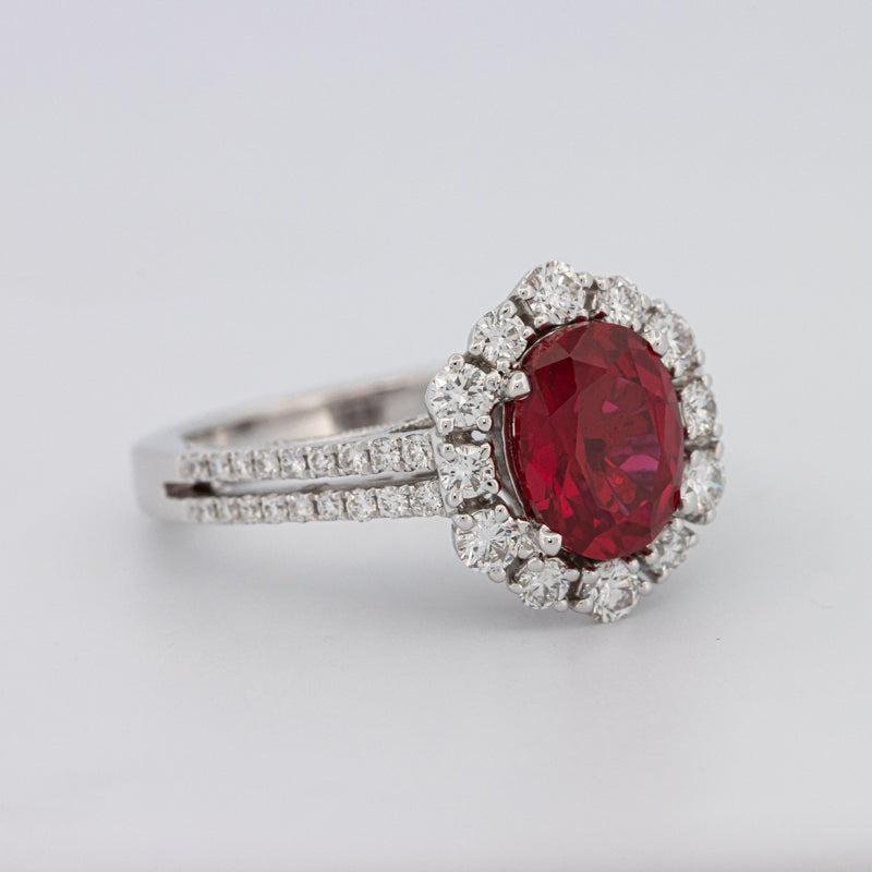 Ein lebendiger 1,30 ct ovaler Rubin wird von einem hellen F/VS-Diamant-Halo umgeben, der insgesamt 0,60 ct für einen auffälligen Farbkontrast und raffinierten Glanz sorgt.