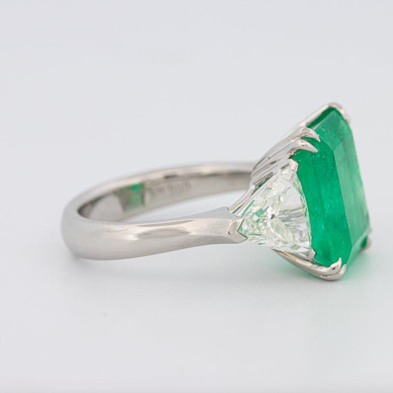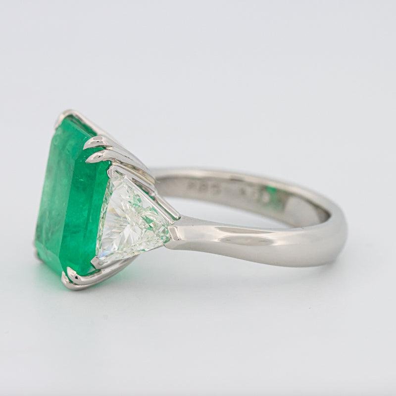 Ein lebendiger 6,58 ct kolumbianischer Smaragd zieht alle Blicke auf sich, flankiert von zwei G/VS1-Diamanten im dreieckigen Schliff für einen klaren Grün-Weiß-Kontrast.
