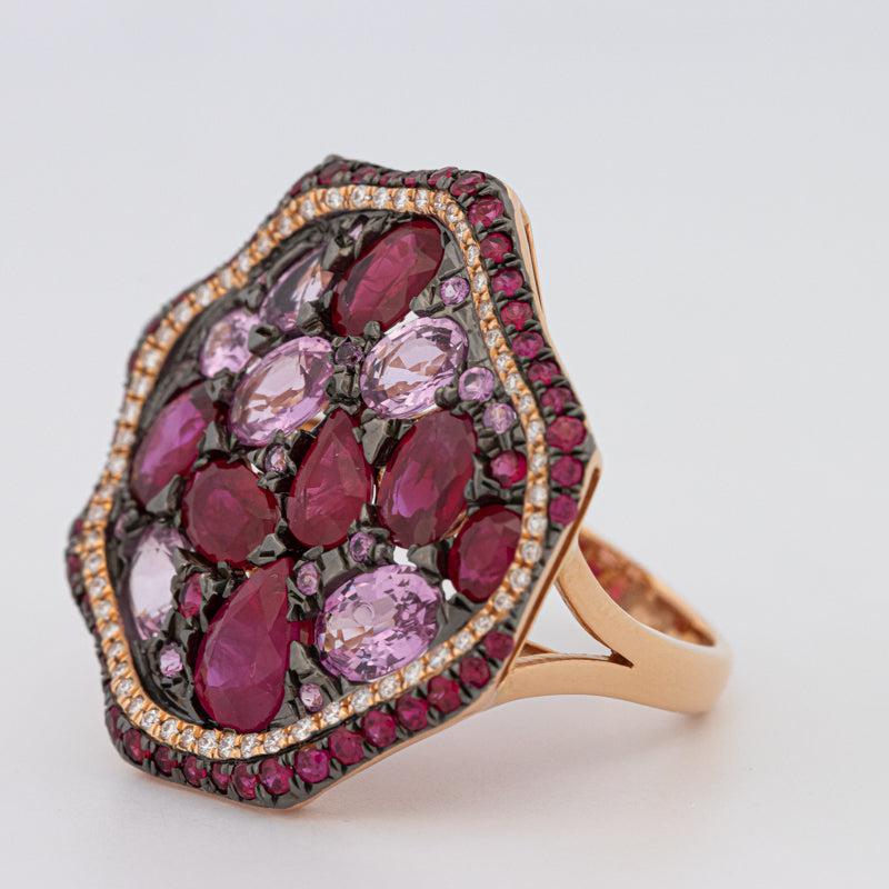 Ein lebendiges Mosaik aus 4.15 ct roten Rubinen und 2.78 ct rosa Saphiren wird durch F/VS Diamantakzente von insgesamt 0.25 ct für mehrschichtige Farbe und Funkeln hervorgehoben.