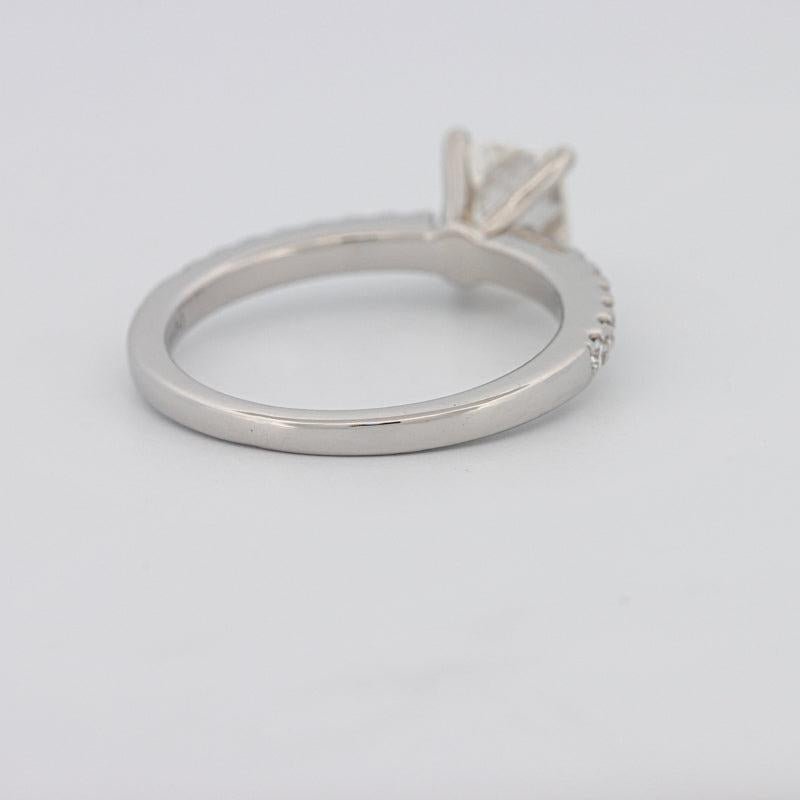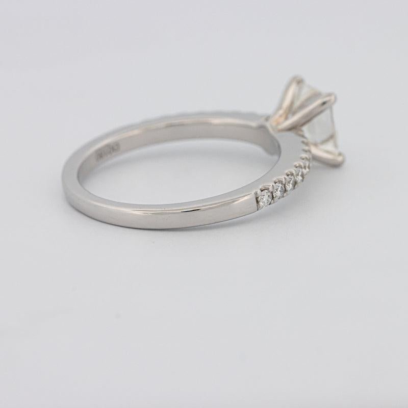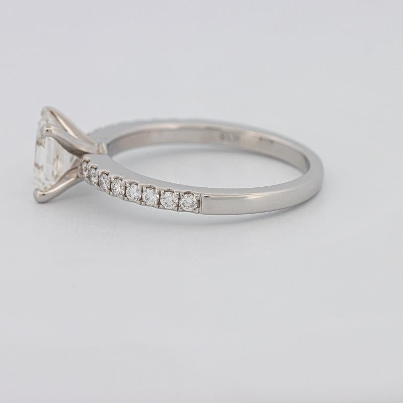 Ein 0.92 ct G/VS1 quadratischer Smaragdschliff-Zentrum ist auf einem raffinierten Pavé-Band mit F/VS-Akzenten von insgesamt 0.25 ct für einen klaren, ausgewogenen Glanz gesetzt.