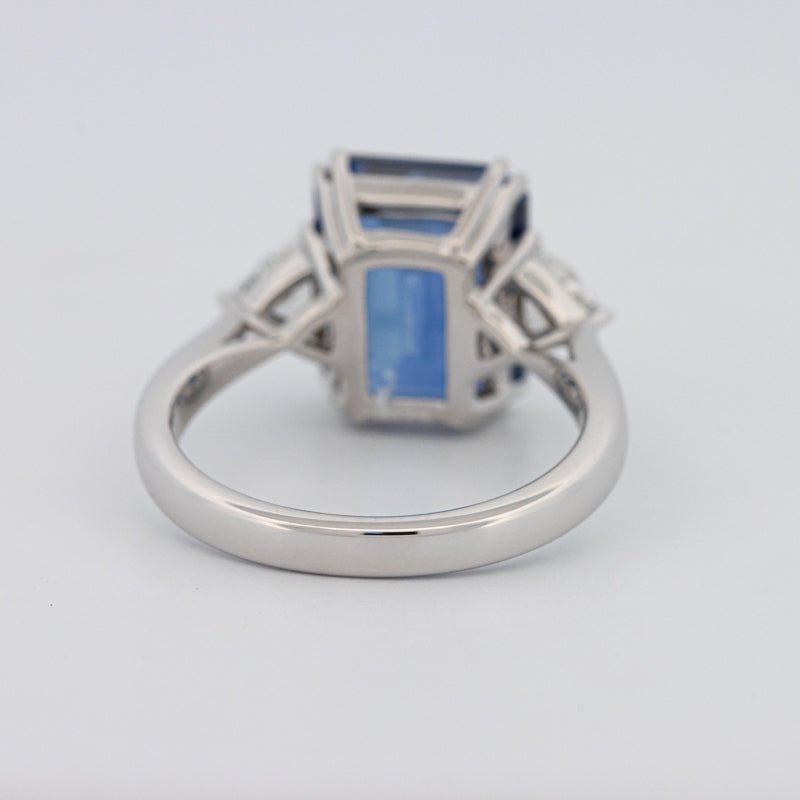 Ein beeindruckender 5.88 ct Emerald-Cut blauer Saphir bildet das Herzstück eines raffinierten Trilogiesteins, dessen tiefer Farbton von hellen F/VS Lab‑Grown Diamantakzenten eingerahmt wird.