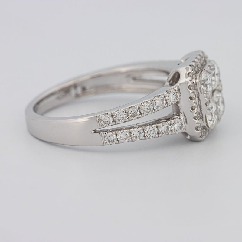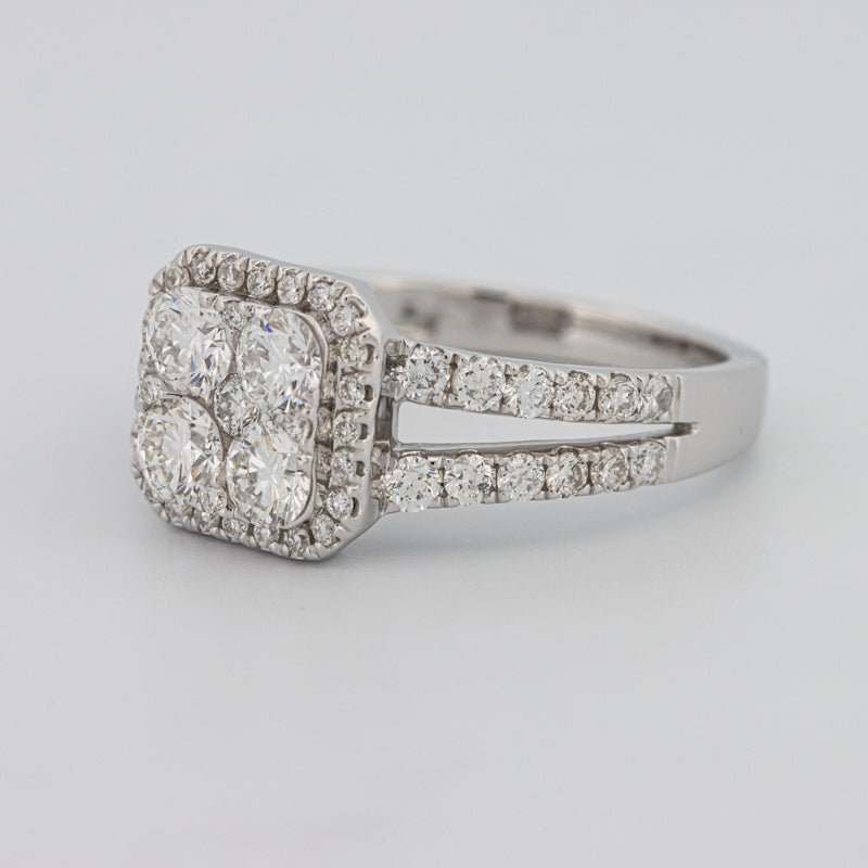 Ein klares quadratisches Halo-Design umfasst insgesamt 1,44 ct Diamanten für ein helles, gleichmäßiges Funkeln mit einem raffinierten, modernen Profil.