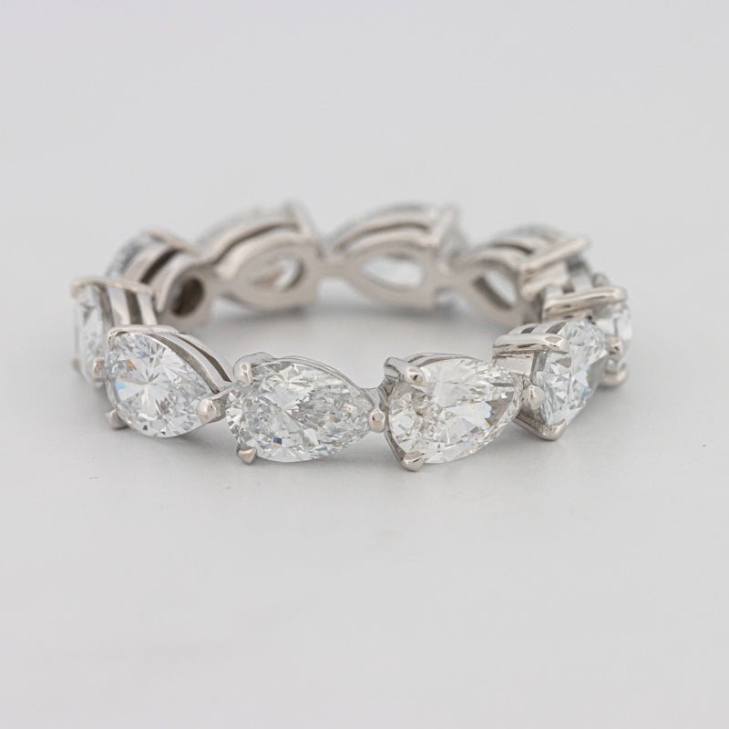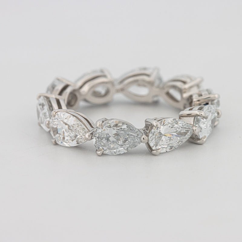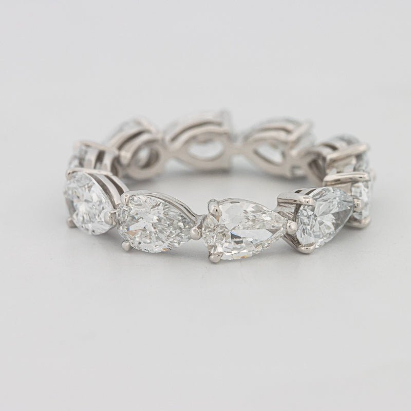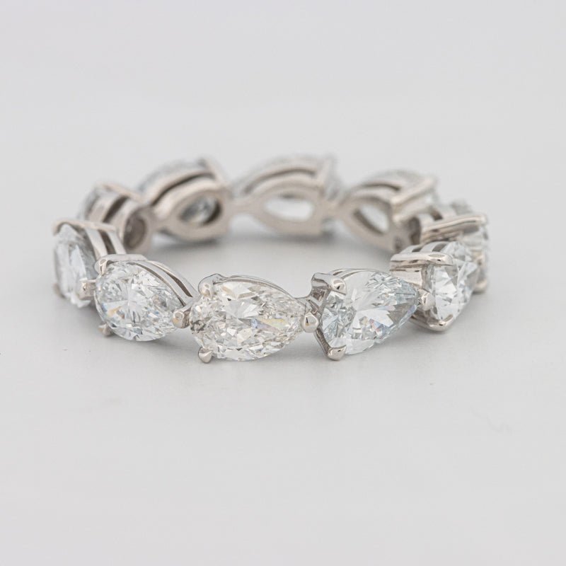 Diamantes pera E–F/VS emparejados uniformemente crean un brillo continuo y una elegancia escultórica alrededor de toda la banda.
