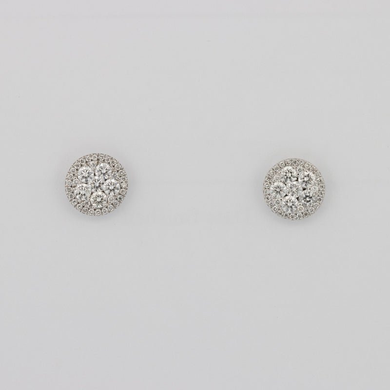 Un motivo redondo con engaste invisible enmarcado por un fino halo totaliza 1.20 ct de diamantes F/VS para un brillo de alto impacto en una silueta compacta.