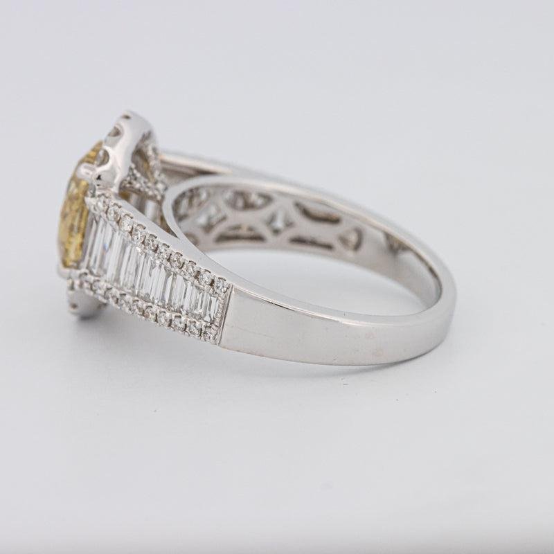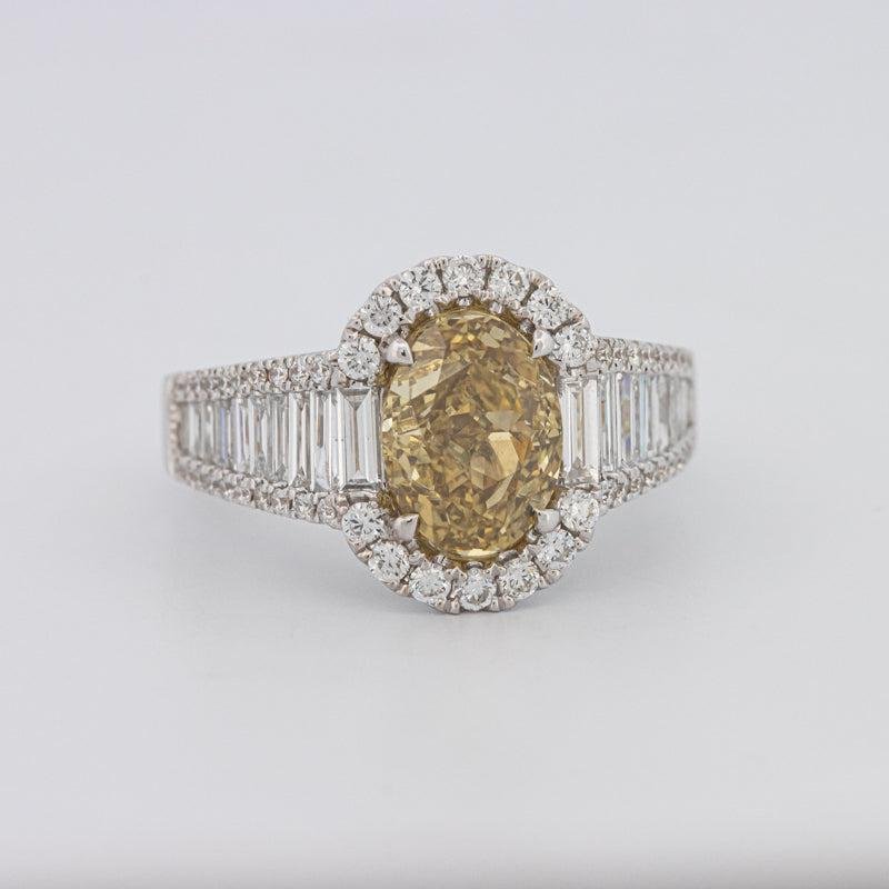 Un centre Fancy Deep Yellow de 2.02 ct certifié GIA en clarté VS ancre ce design, rehaussé par des accents de diamants brillants E/VS totalisant 1.50 ct.