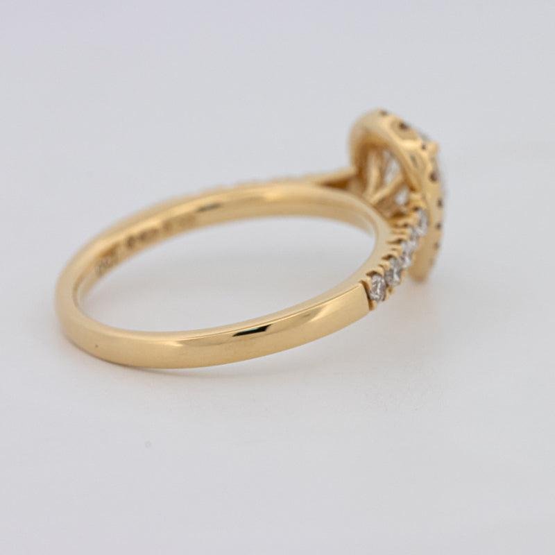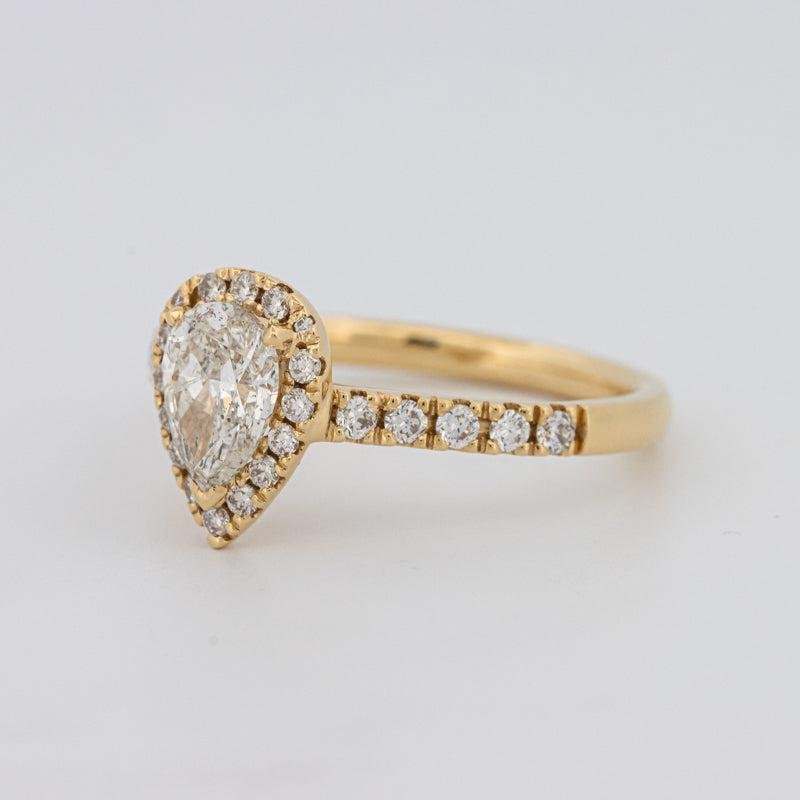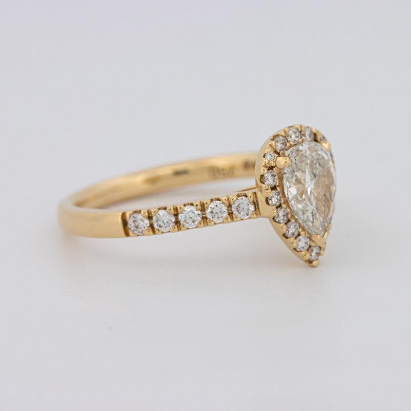 Un centre en forme de poire de 0.76 ct certifié HRD en H/SI2 est encadré par un halo et un anneau lumineux en F/VS totalisant 0.50 ct pour un éclat gracieux et allongé.