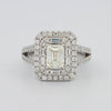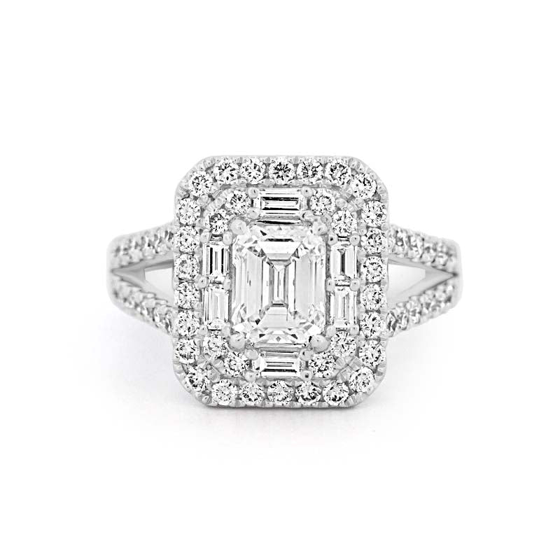 Un centre de 1.04 ct J/VVS1 coupe émeraude est encadré par un halo raffiné, mettant en valeur des lignes épurées et des éclats miroirs.
