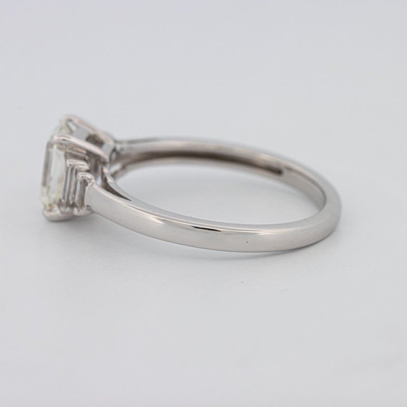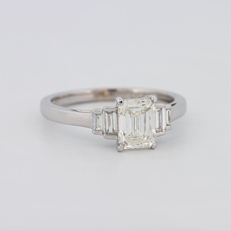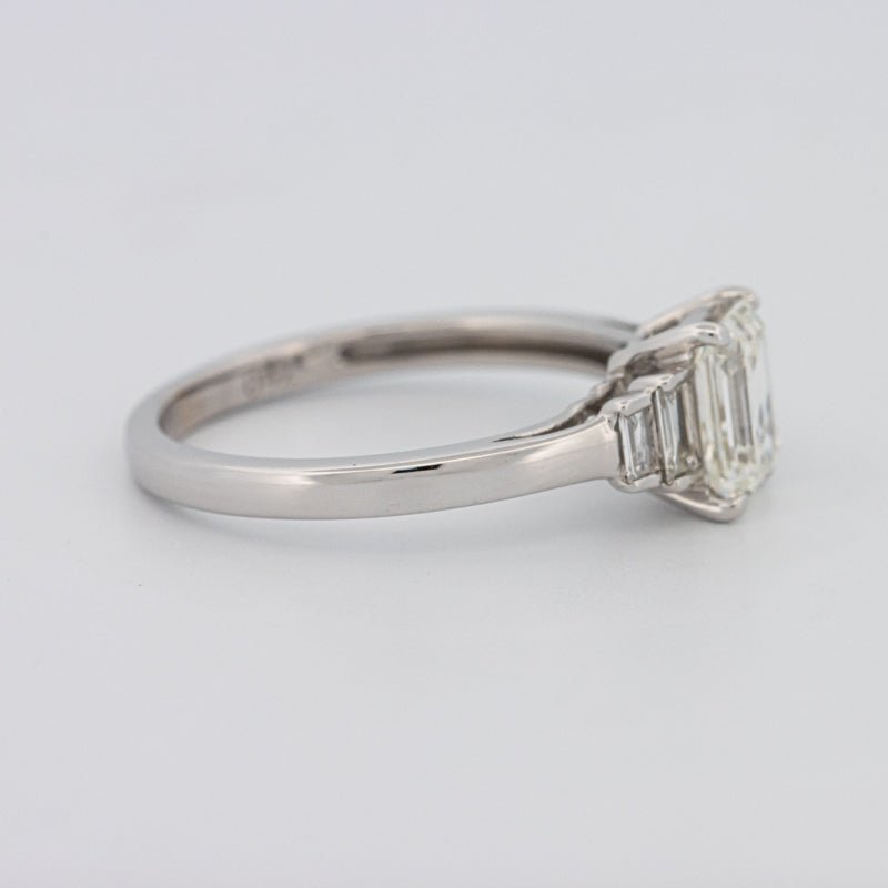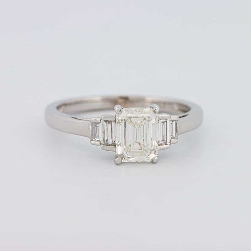 Un diamant taille émeraude de 1.07 ct I/VVS1 certifié HRD occupe le devant de la scène, flanqué de pierres latérales F/VS éclatantes qui rehaussent sa géométrie raffinée à taille en gradins.