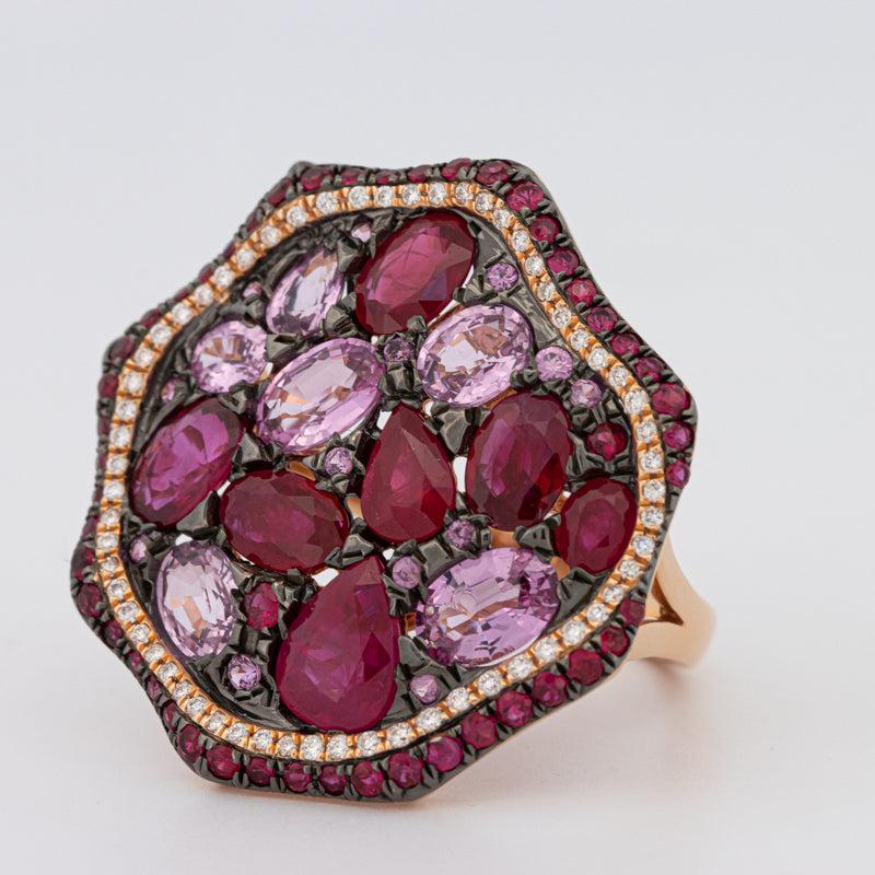 Une mosaïque vibrante de rubis rouges de 4.15 ct et de saphirs roses de 2.78 ct est rehaussée par des accents de diamants F/VS totalisant 0.25 ct pour une couleur et un éclat superposés.