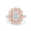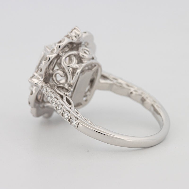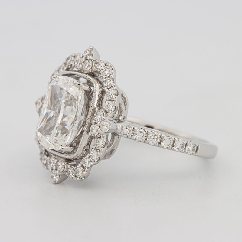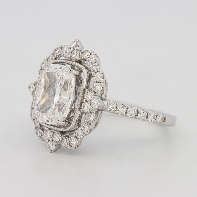 Le Queen Solitaire présente une taille coussin de 3.08 ct lab‑grown avec une couleur E éclatante et une pureté VVS2, offrant une brillance vive avec des coins doucement arrondis pour un profil romantique.