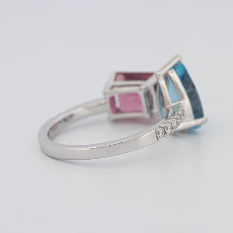 Aigue-marine poire 1.60 ct • Tourmaline carrée radiant 1.70 ct • Pierres latérales 0.20 ct — F / VS • Or blanc 18K • 3.00g