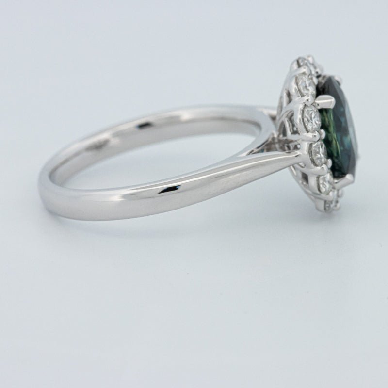 Un saphir bleu ovale naturel de 2,00 ct ancre ce solitaire halo, sa couleur riche encadrée par un fin halo de diamants micro-pavé pour une brillance amplifiée.