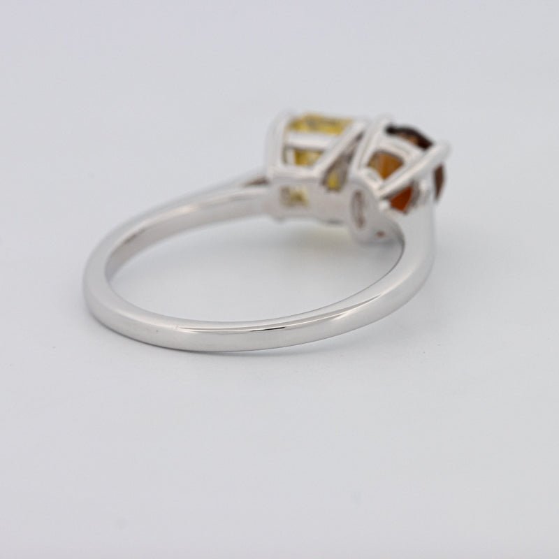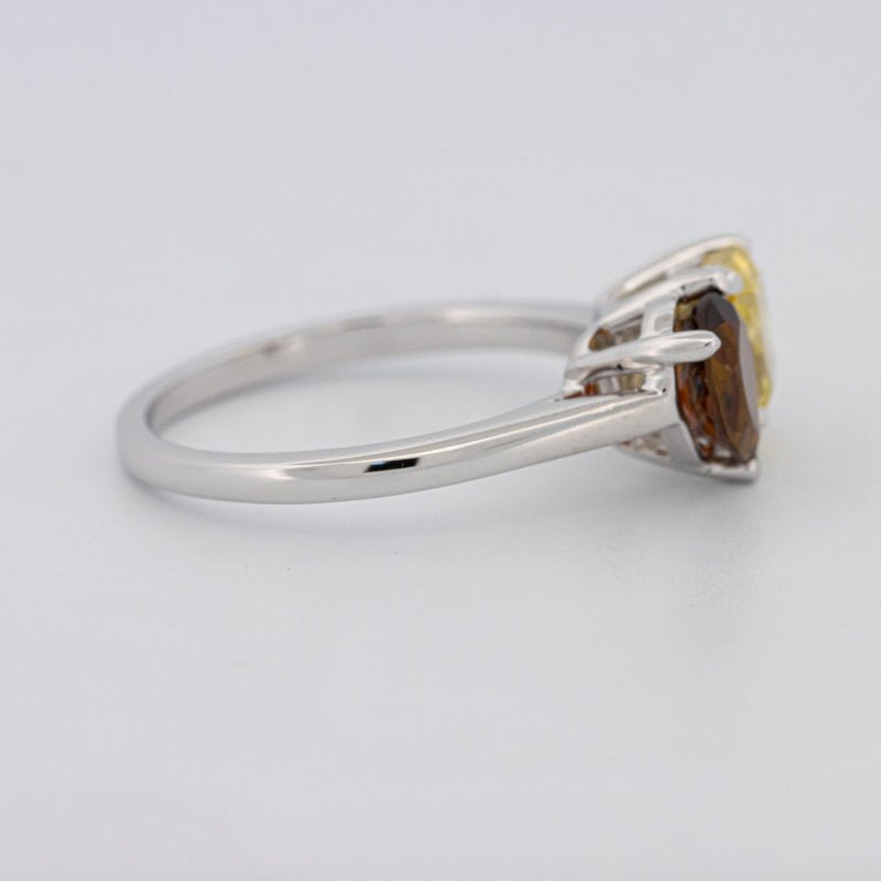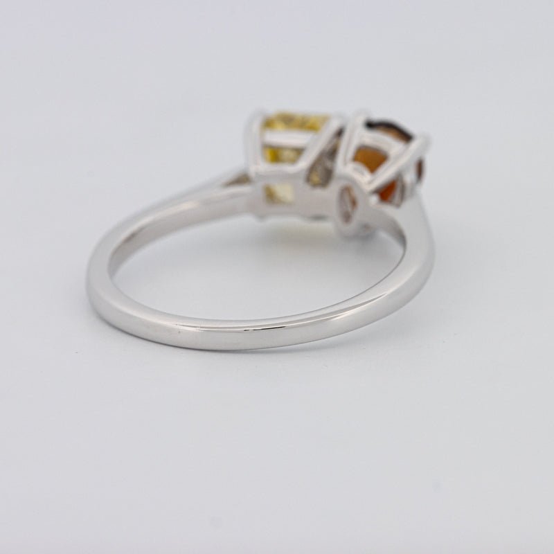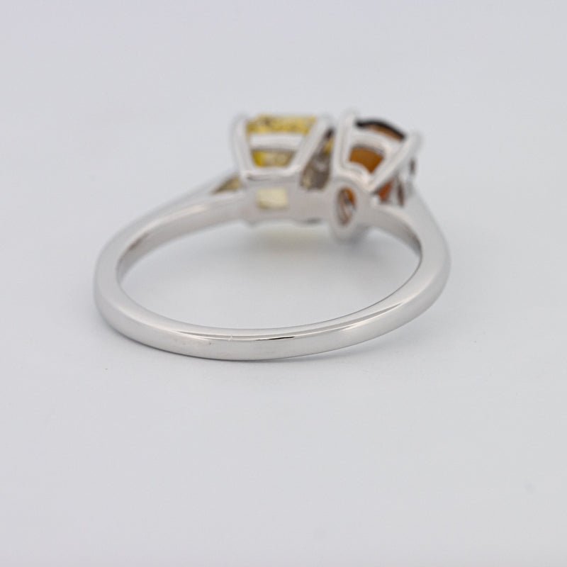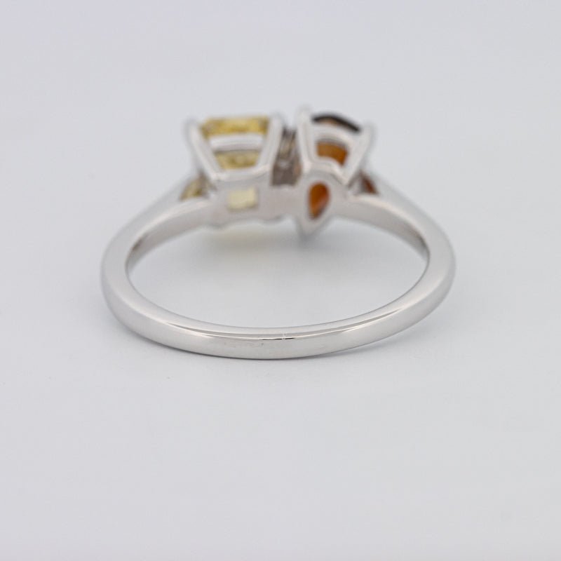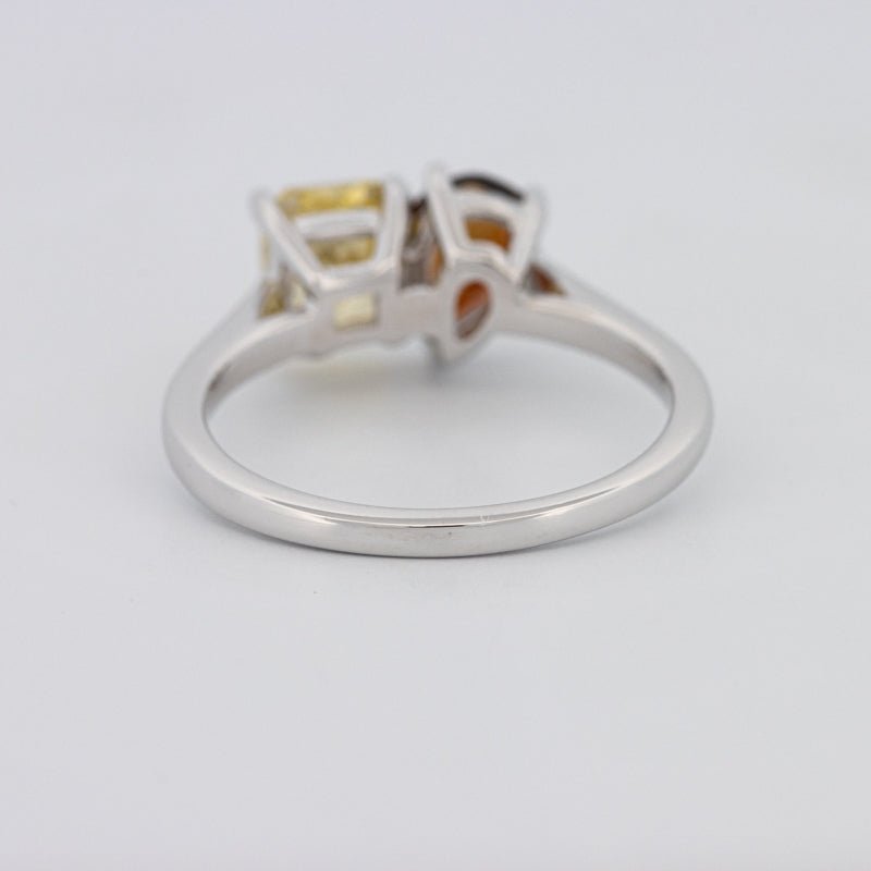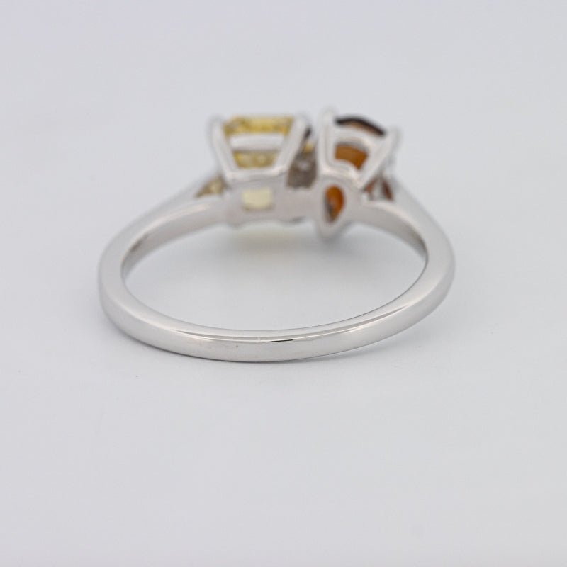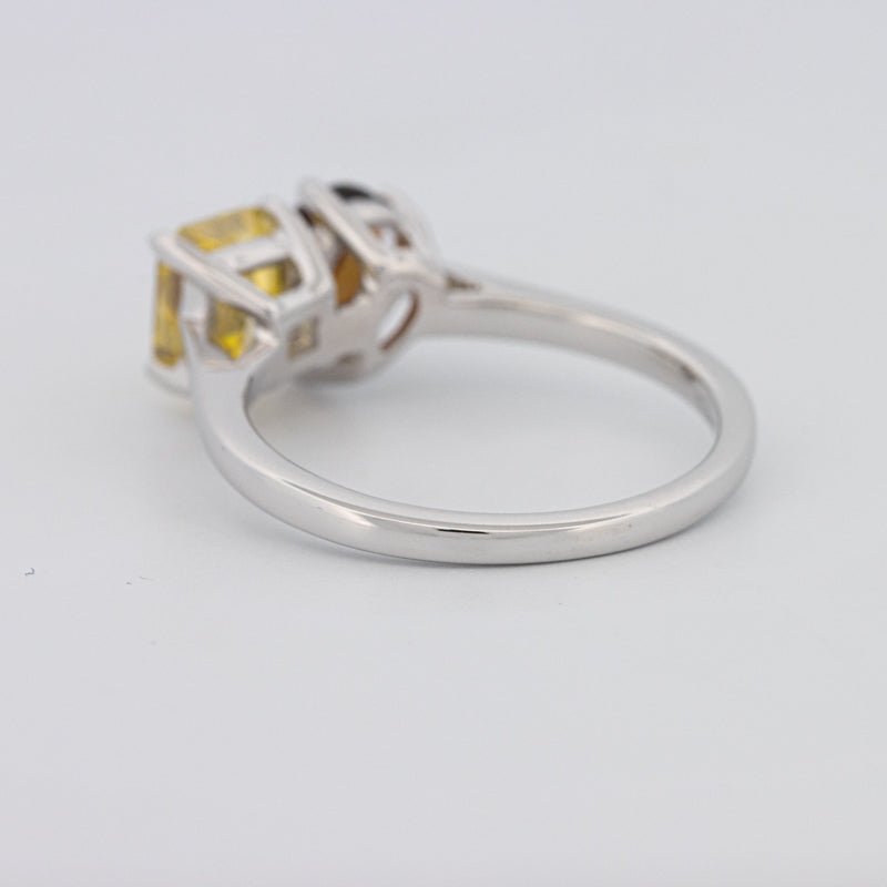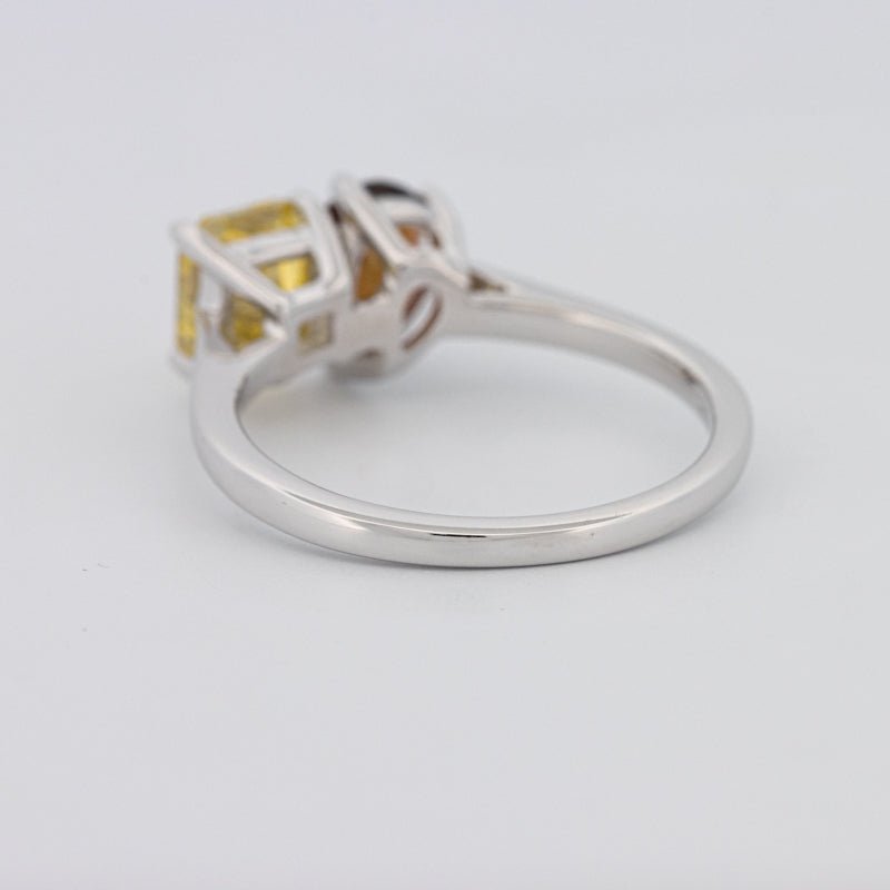 Un diamant jaune carré radiant de 1.00 ct s'associe à une tourmaline poire de 0.58 ct dans une silhouette moderne Toi et Moi pour un contraste et un équilibre saisissants.