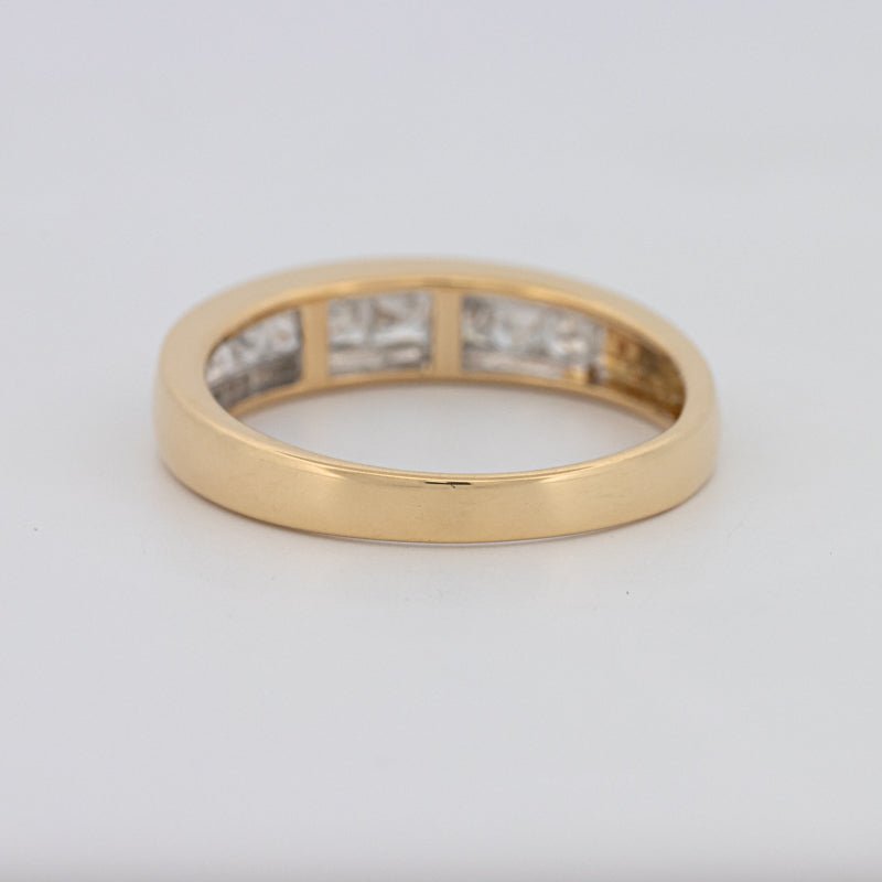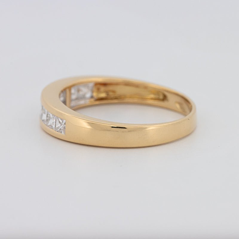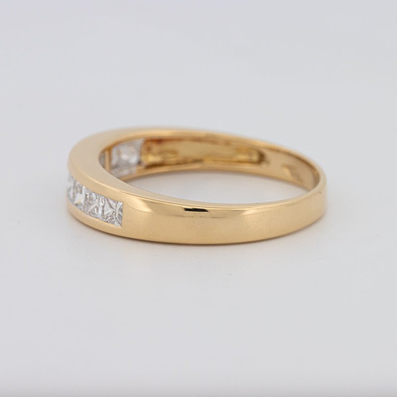 Une bande élégante de diamants à coupe princesse F/VS totalisant 1.10 ct offre une scintillation moderne continue avec des facettes carrées nettes.