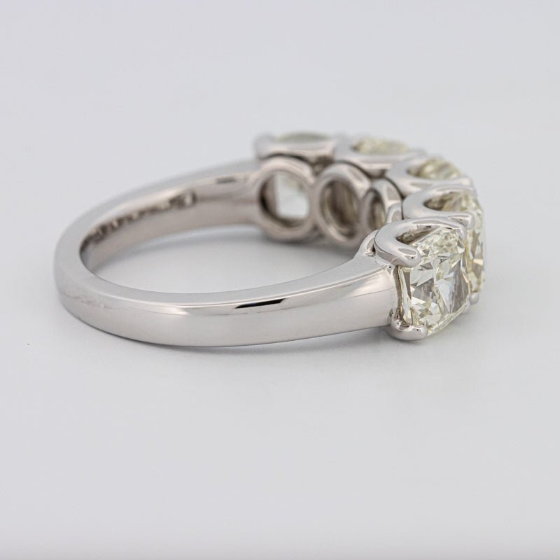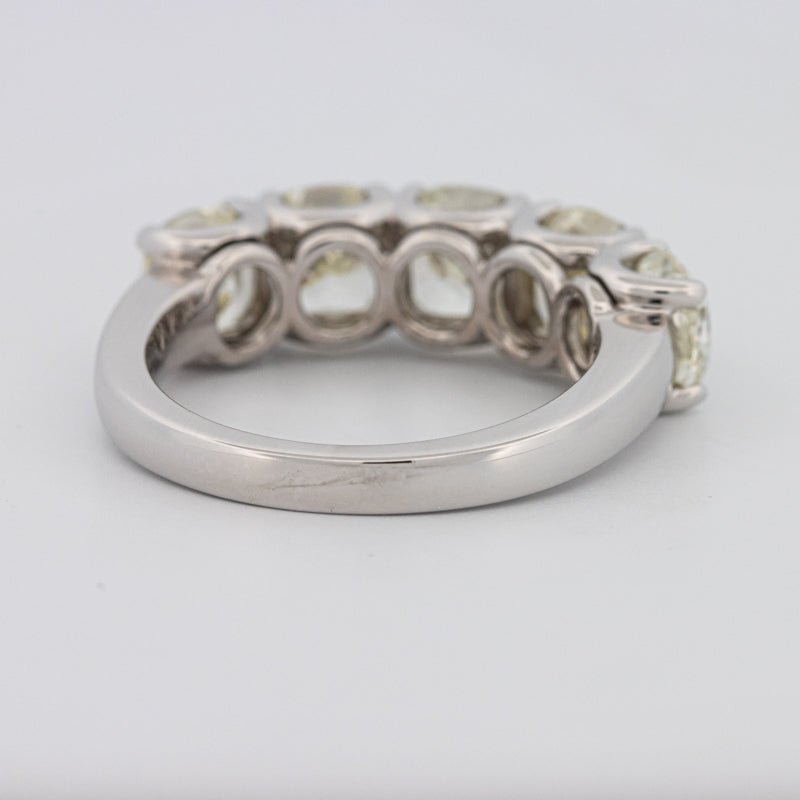 Vijf Fancy Gele Licht kussen-geslepen diamanten met een totaal van 5.35 ct stralen een warme, levendige kleur uit met verfijnde symmetrie.