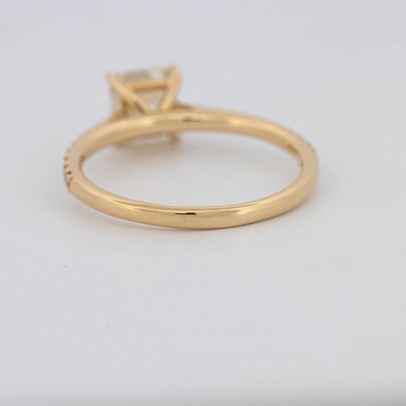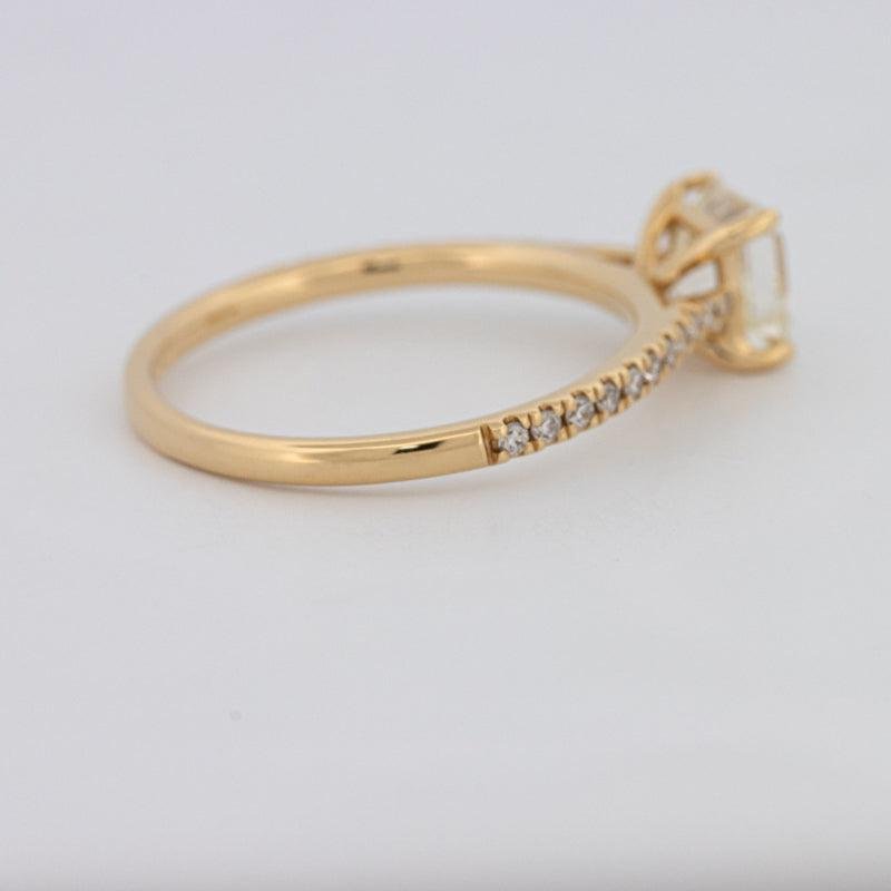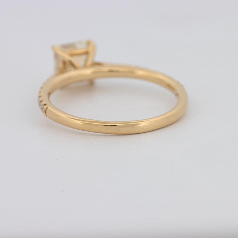 Geplaatst in warm 18K geelgoud met 0.20 ct F/VS pavé accenten, levert het verfijnde solitaire silhouet tijdloze elegantie.