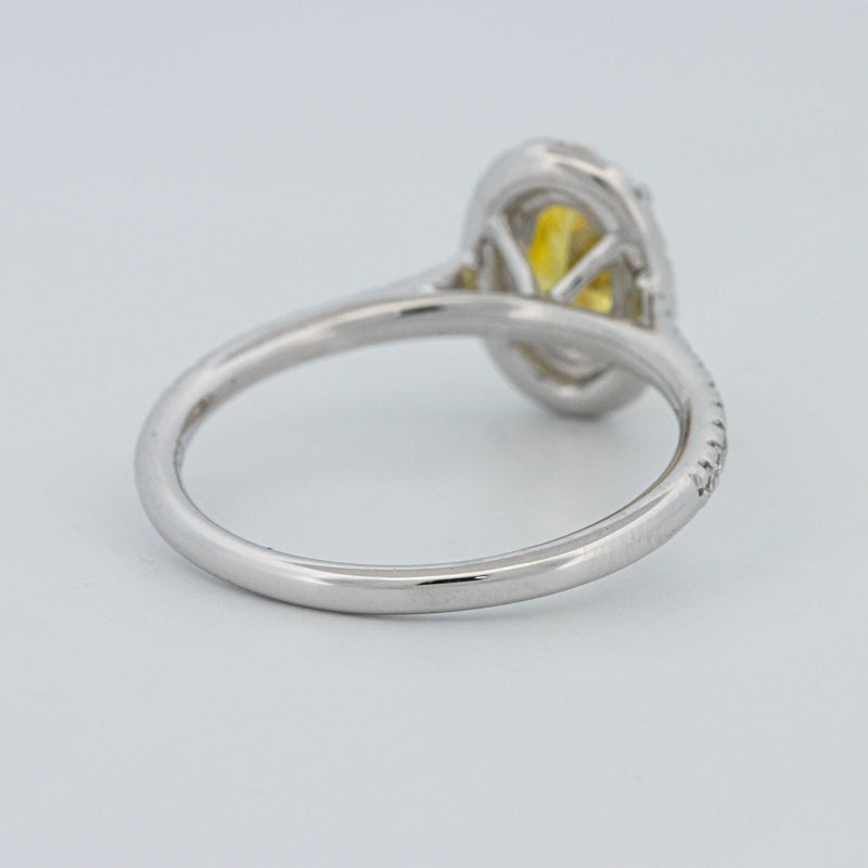 Een 1.00 ct Fancy Yellow Intense lab‑grown ovaal domineert deze halo pavé solitaire, met zijn levendige tint versterkt door een ovale vorm die de kleurpresentie en vingerbedekking vergroot.