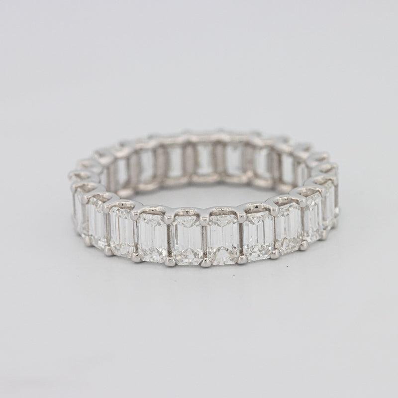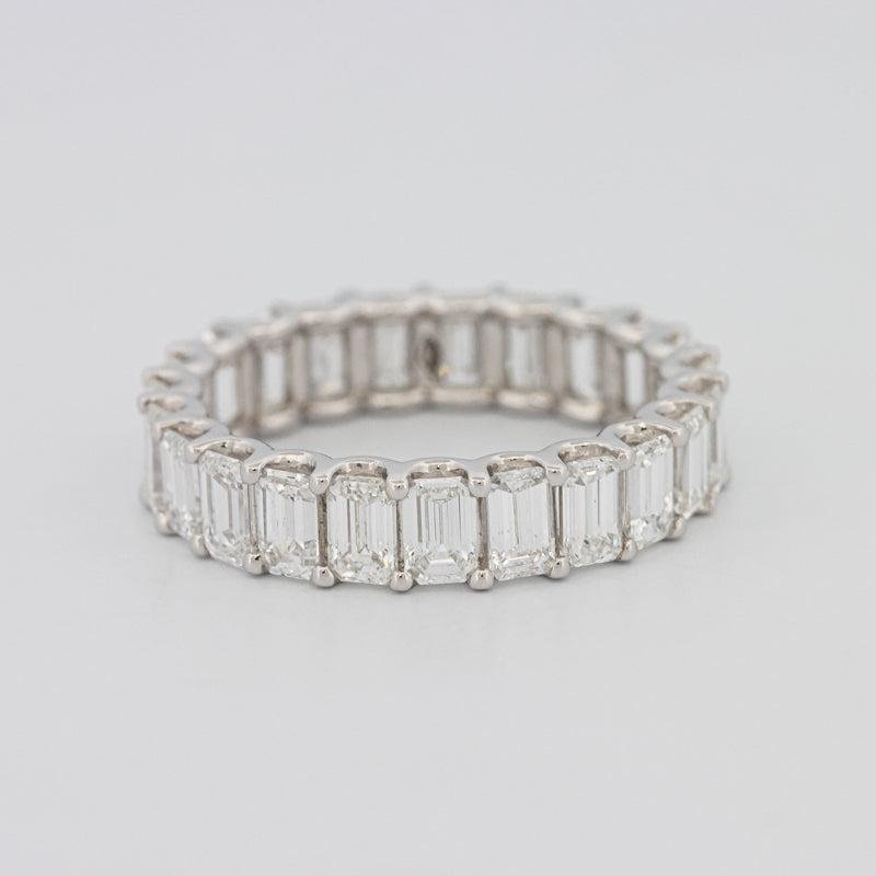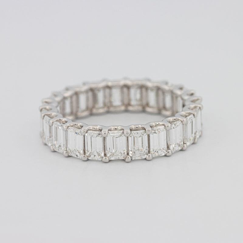 Een ononderbroken cirkel van emerald‑geslepen diamanten levert schone stapgeslepen flitsen en verfijnde symmetrie, symboliserend een ongebroken band.