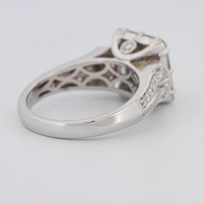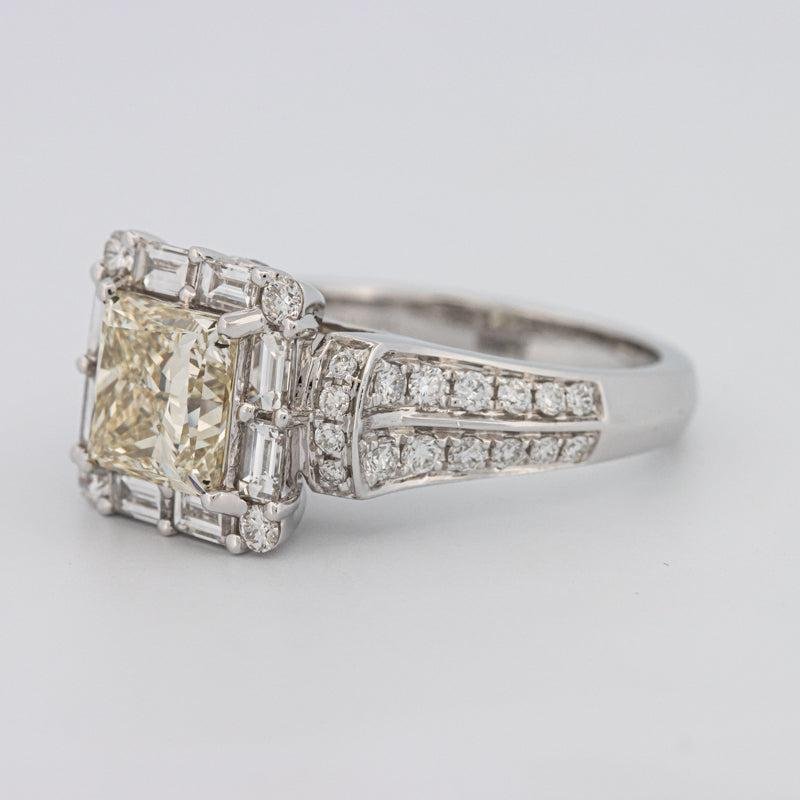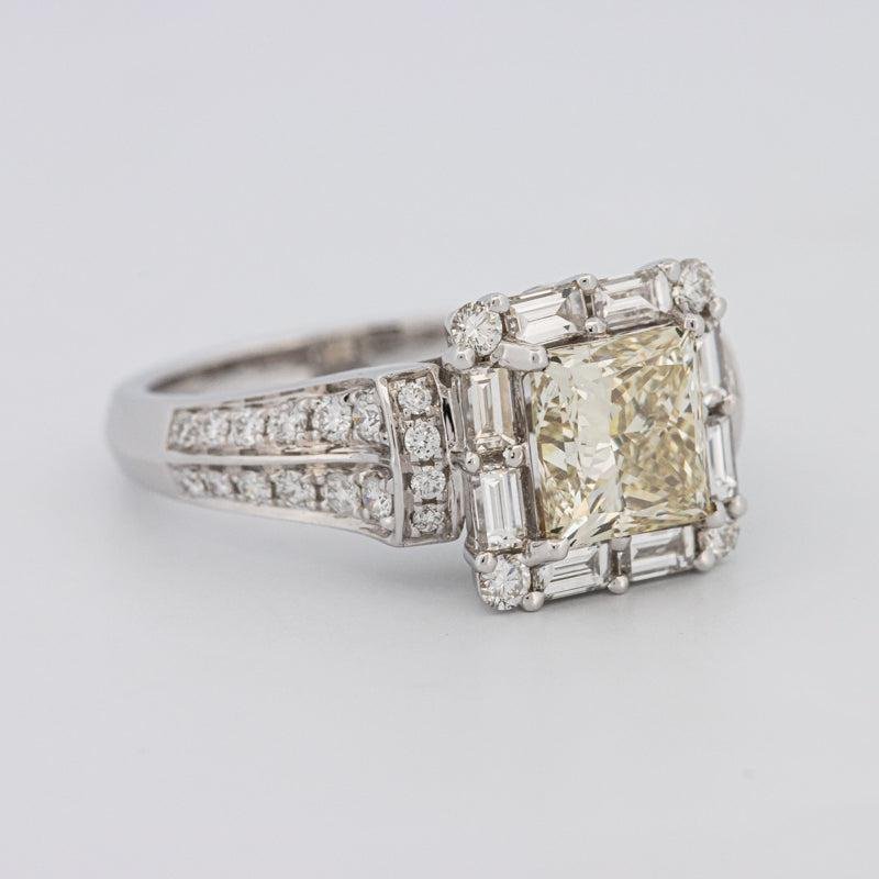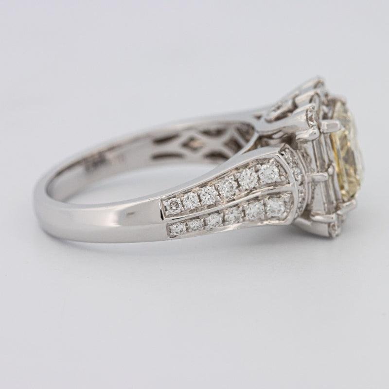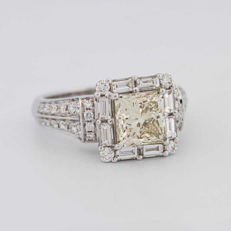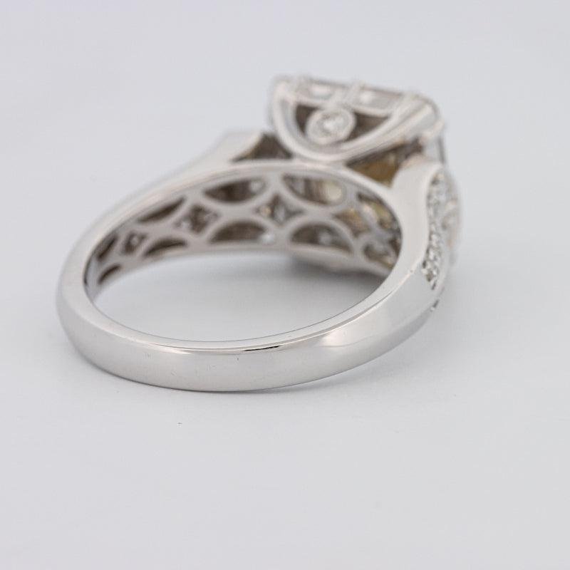 Een GIA-gecertificeerde 2.07 ct Fancy Light Yellow vierkante radiant in zeldzame VVS2 helderheid staat centraal, versterkt door F/VS diamanten accenten van in totaal 1.75 ct.