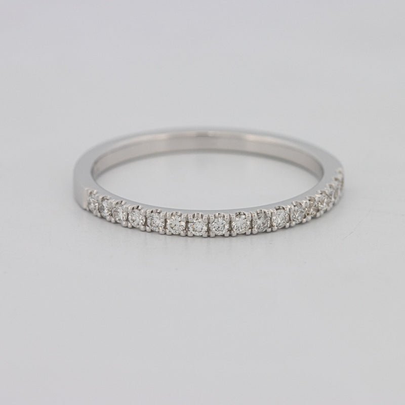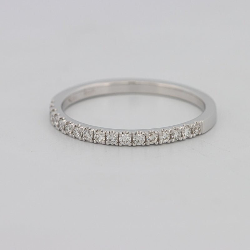 Een slank profiel van 1,70 mm met 0,30 ct F/VS diamanten biedt verfijnde schittering en moeiteloze stapelbaarheid.