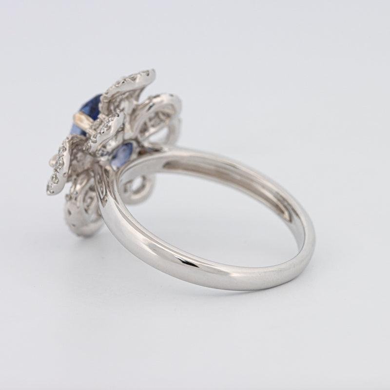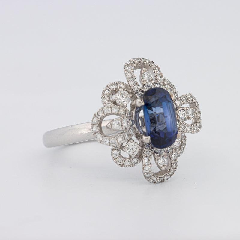 Een diepblauwe ovale saffier bloeit binnen een bloemige halo, terwijl F/VS diamantaccenten de schittering en bloembladachtige symmetrie versterken.