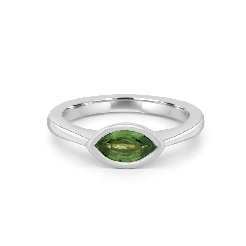 Estetyka „Pinky Charmer” jest uzupełniona subtelnym akcentem zielonego szafiru w stylizacji, dodając świeży kontrast kolorystyczny, nie odwracając uwagi od sylwetki marquise.