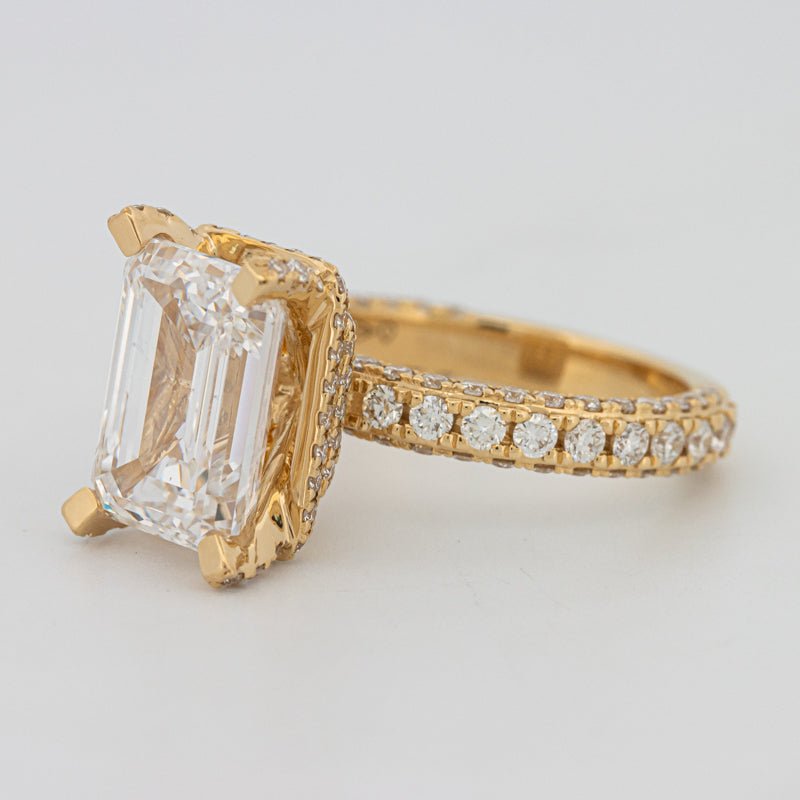 Empire Emerald Cut Solitaire (Lab Grown) Ring prezentuje 5.00 ct diament lab grown (CVD) o szlifie emerald z certyfikatem IGI, w kolorze E i czystości VS1, podkreślając odważną, architektoniczną sylwetkę.