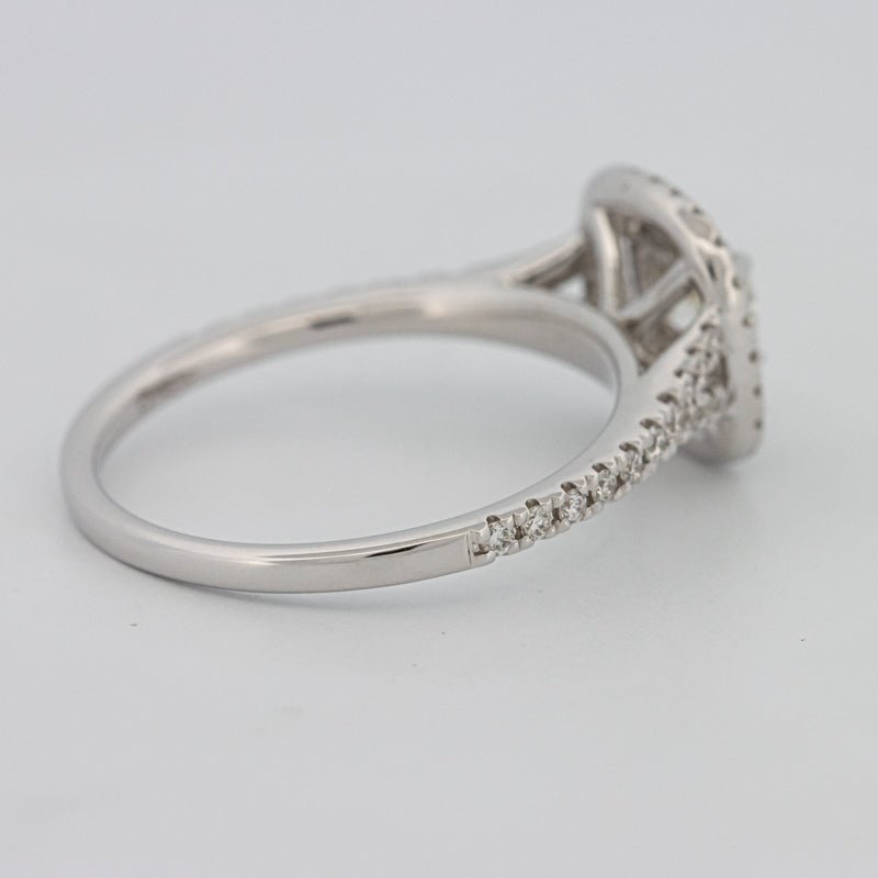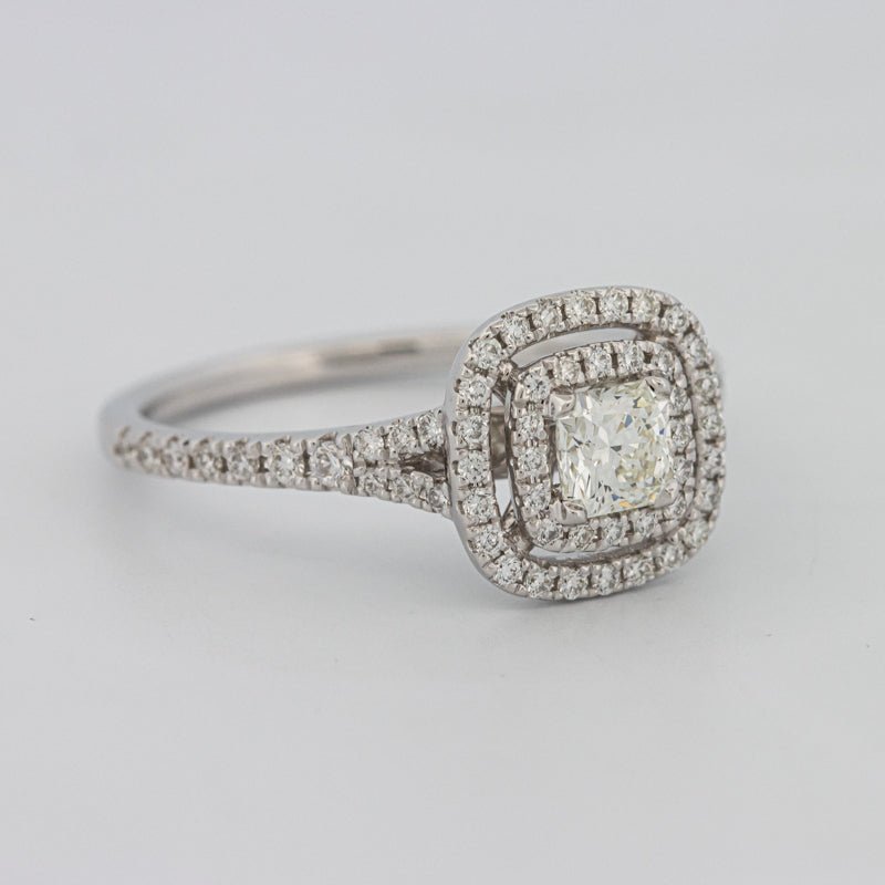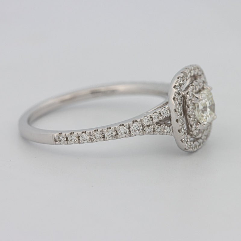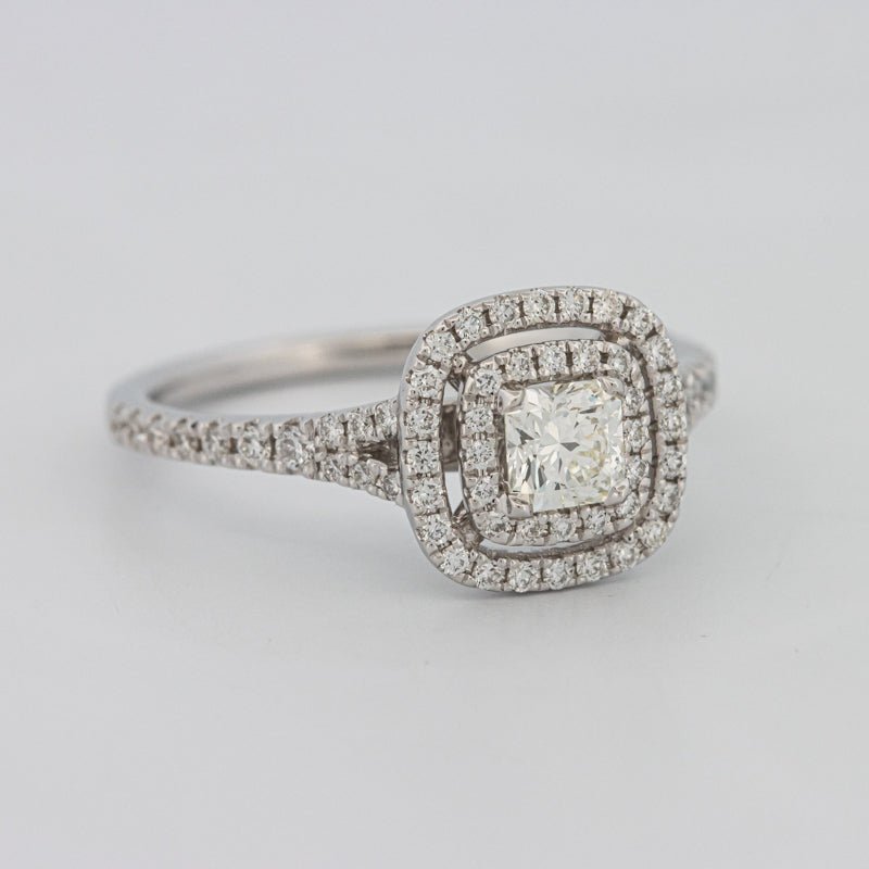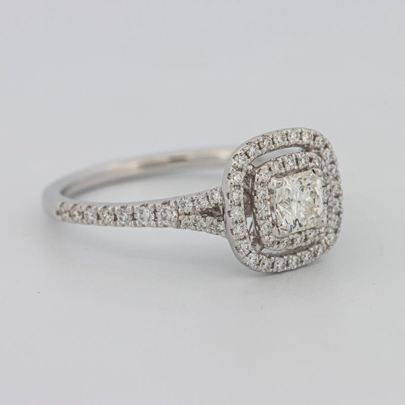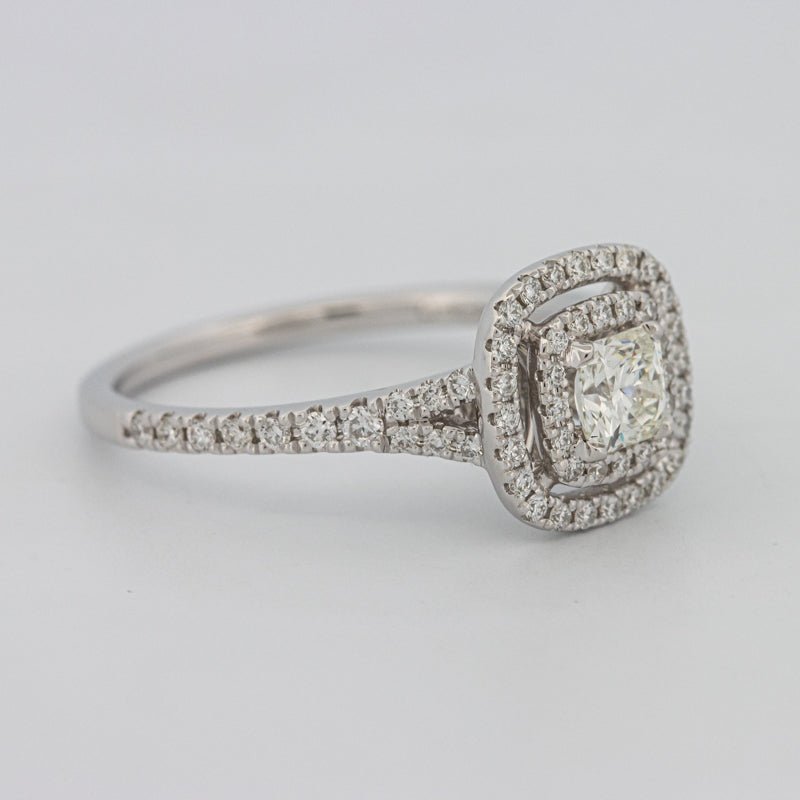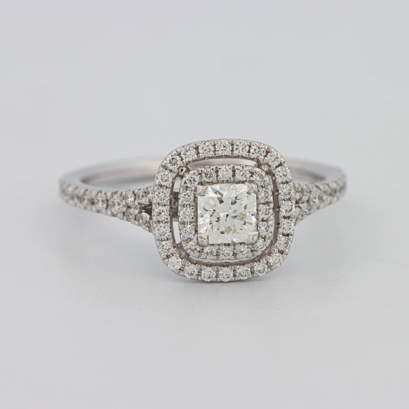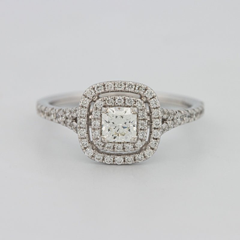 Certyfikowany przez HRD 0.34 ct H/VVS1 kwadratowy radiant w centrum jest otoczony świetlistą aureolą, wzmacniając blask i wyrafinowaną prezencję.