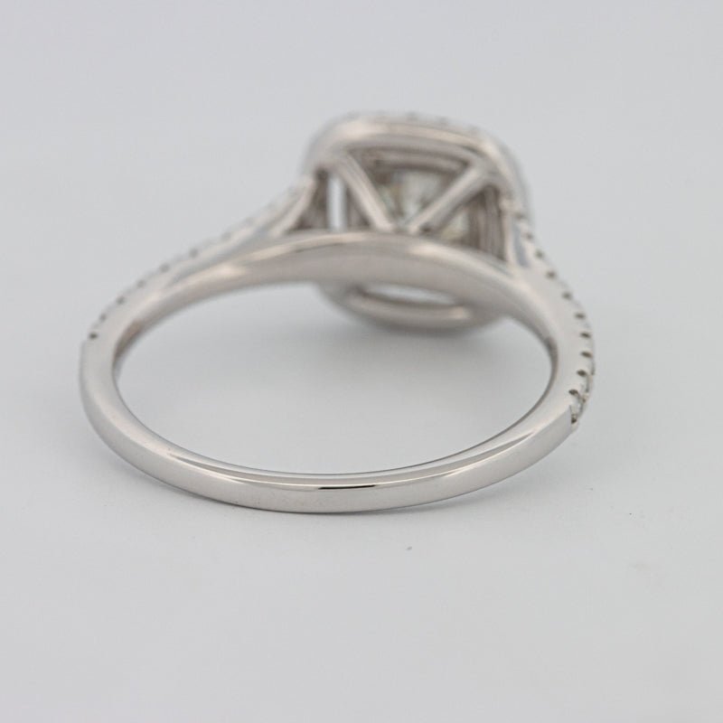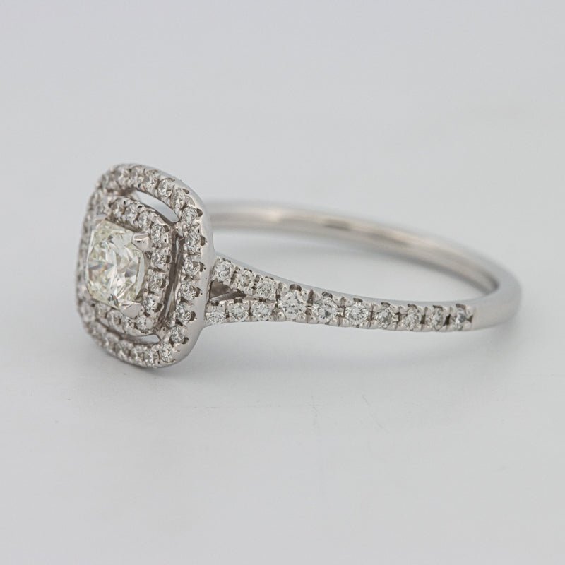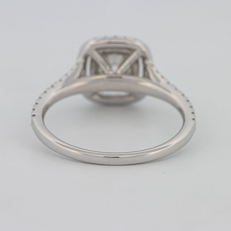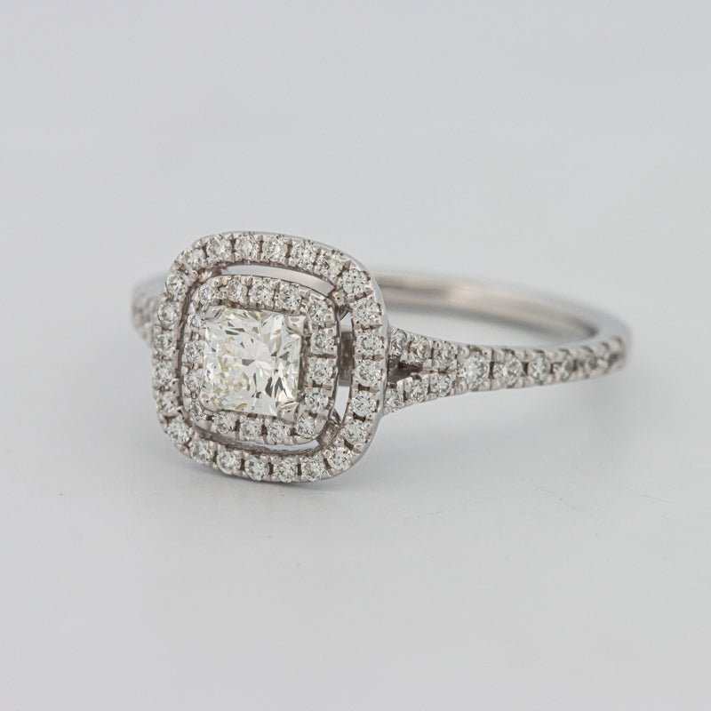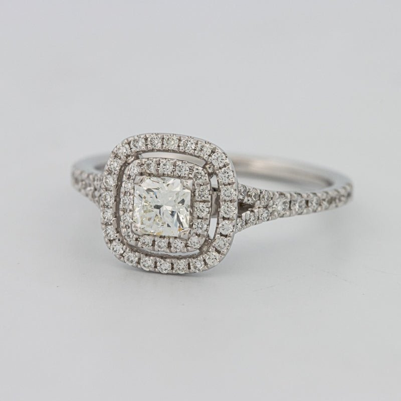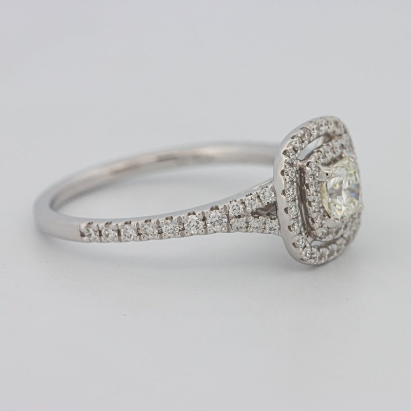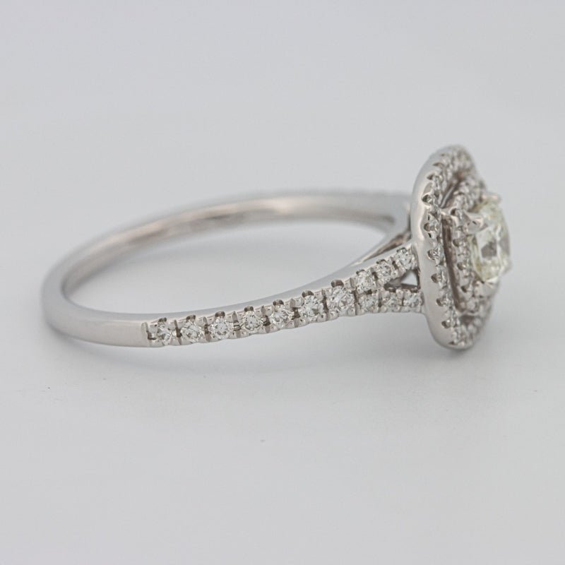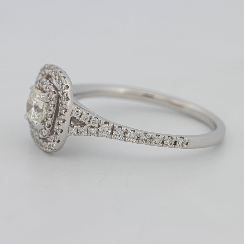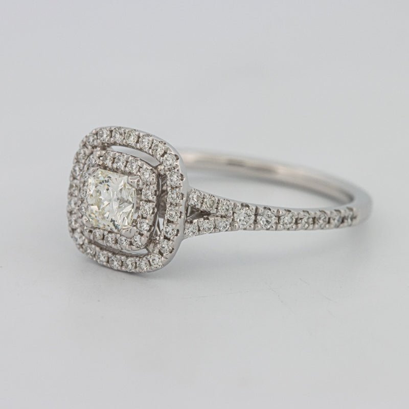 Certyfikowany przez HRD 0.34 ct H/VVS1 kwadratowy radiant w centrum jest otoczony świetlistą aureolą, wzmacniając blask i wyrafinowaną prezencję.