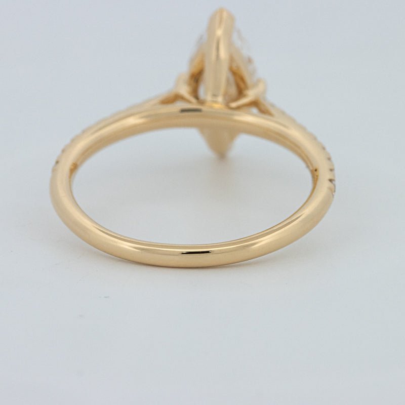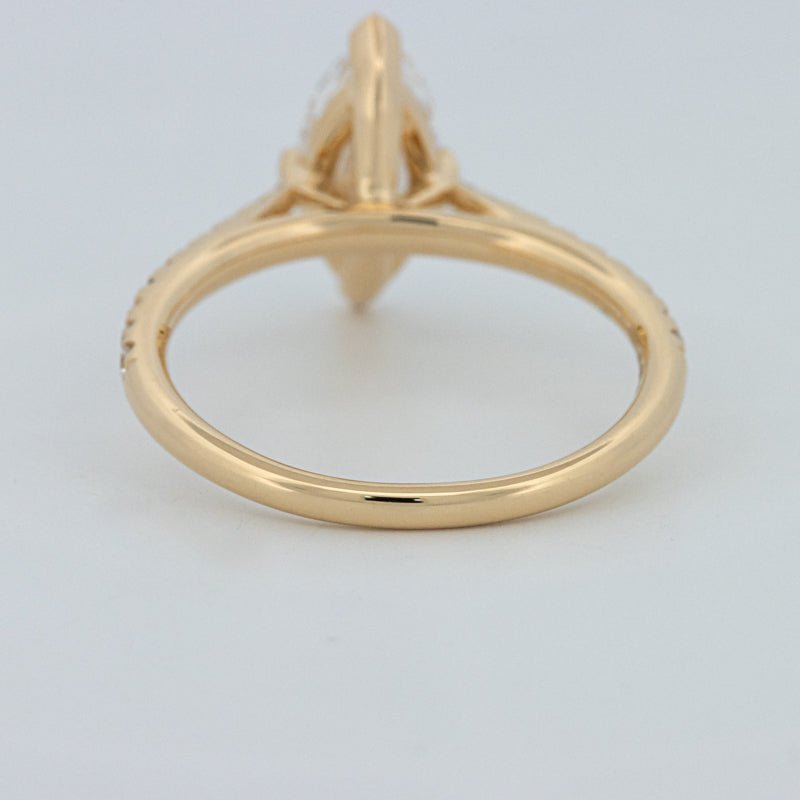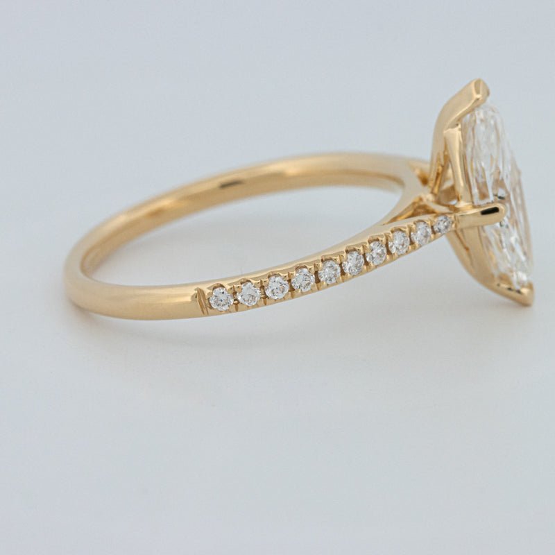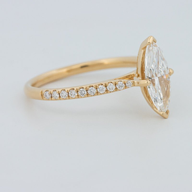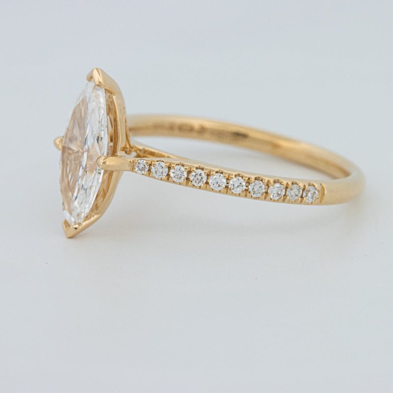 Około 1,30 ct D-E/VS1-VS2 diament syntetyczny w szlifie markiza wieńczy ten solitaire pavé, oferując wydłużony blask i pochlebny, podkreślający sylwetkę palca wygląd.