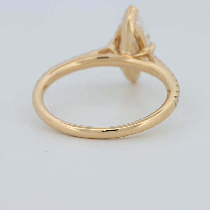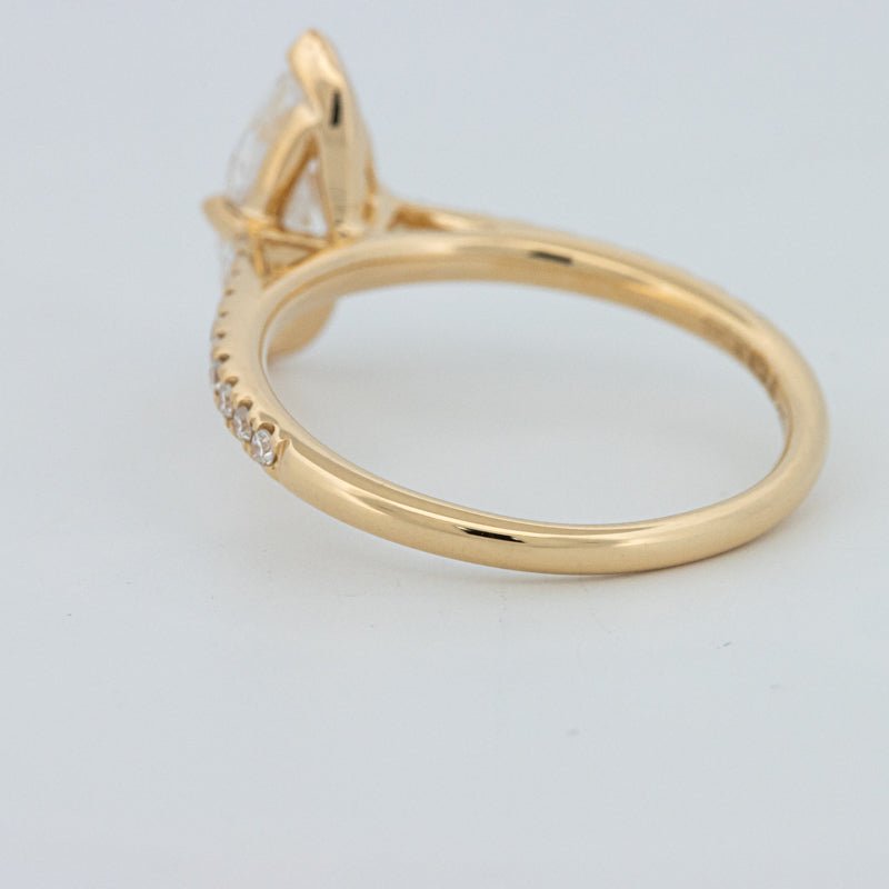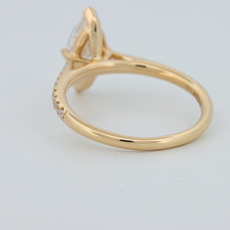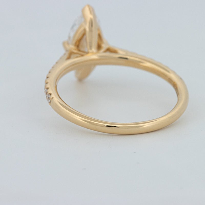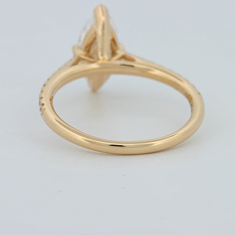 Około 1,30 ct D-E/VS1-VS2 diament syntetyczny w szlifie markiza wieńczy ten solitaire pavé, oferując wydłużony blask i pochlebny, podkreślający sylwetkę palca wygląd.
