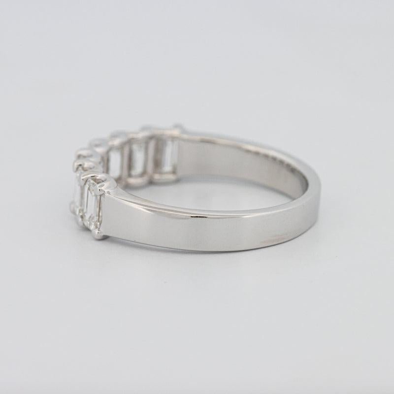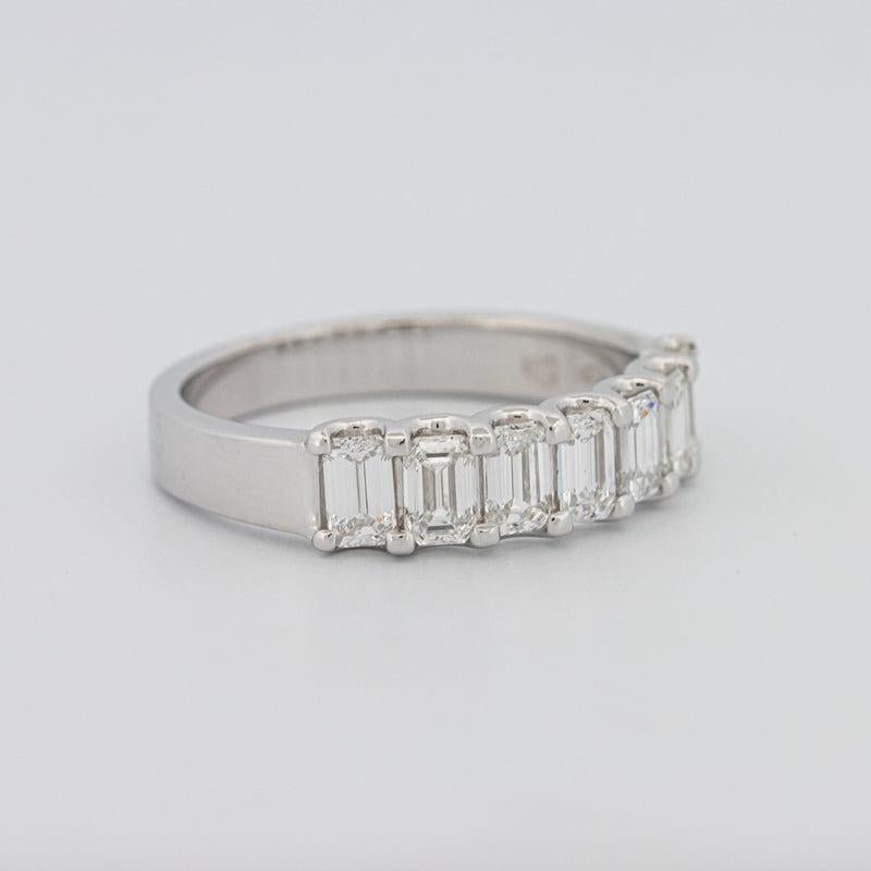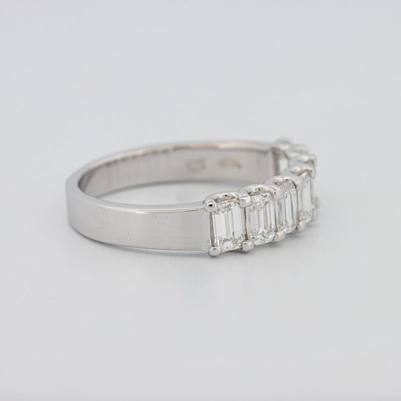 Sete diamantes corte esmeralda F/VS totalizando 1.30 ct criam flashes espelhados elegantes e simetria refinada.