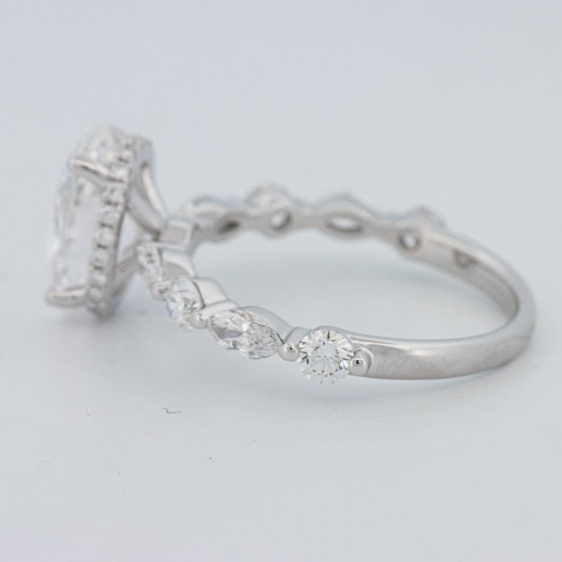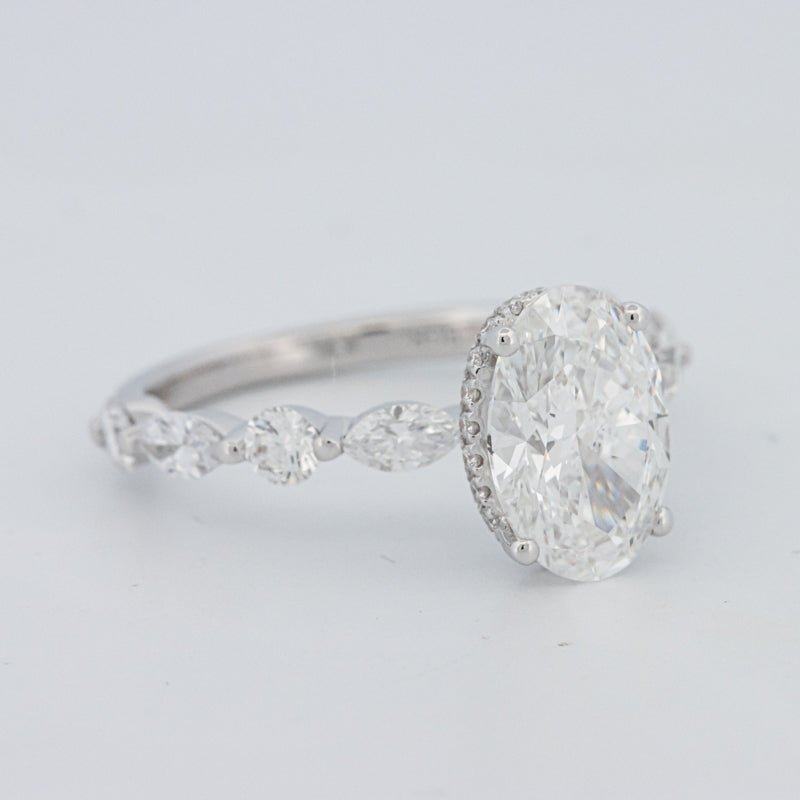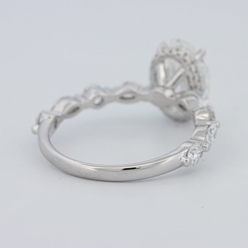 O Oval Under‑Halo Pavé Solitaire apresenta um diamante oval lab‑grown de 2.08 ct D/VS1 rodeado por 1.00 ct de pedras laterais naturais, criando um equilíbrio deslumbrante de profundidade e brilho.