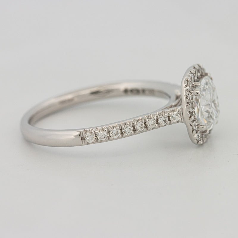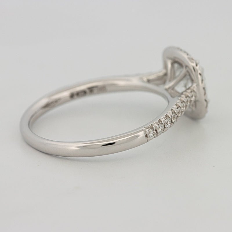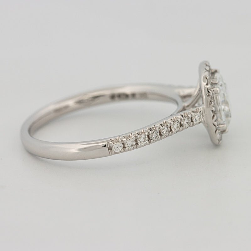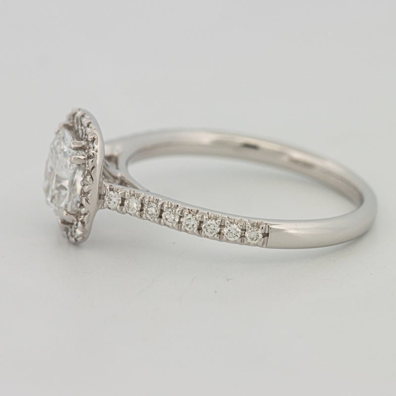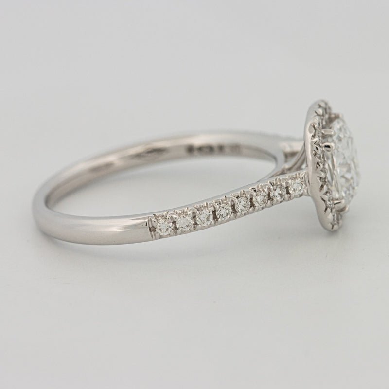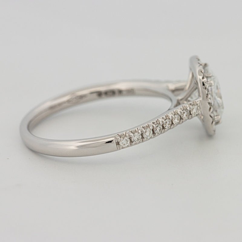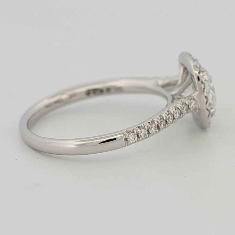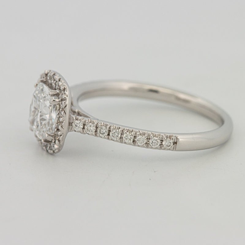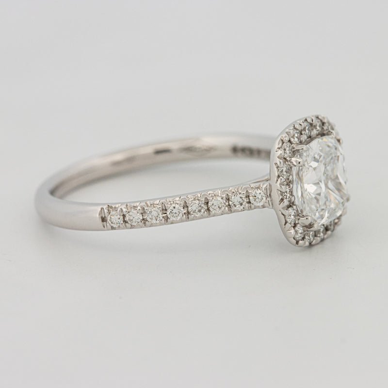 Um centro de almofada D–E/VS brilhante é emoldurado por um halo preciso e ombros pavé, amplificando a dispersão e cintilação com um perfil refinado e discreto.