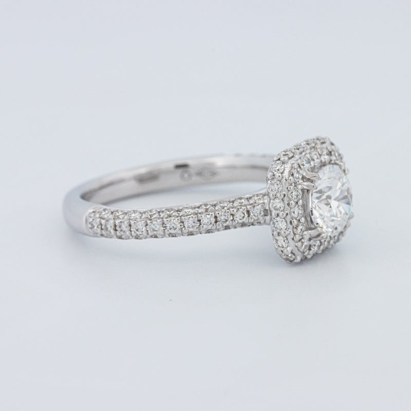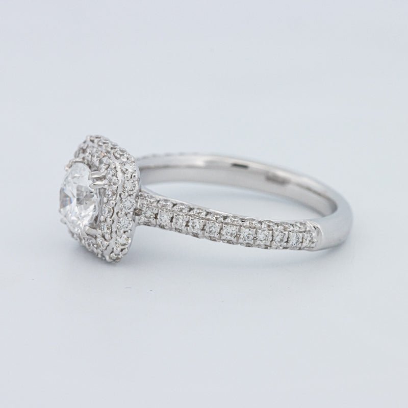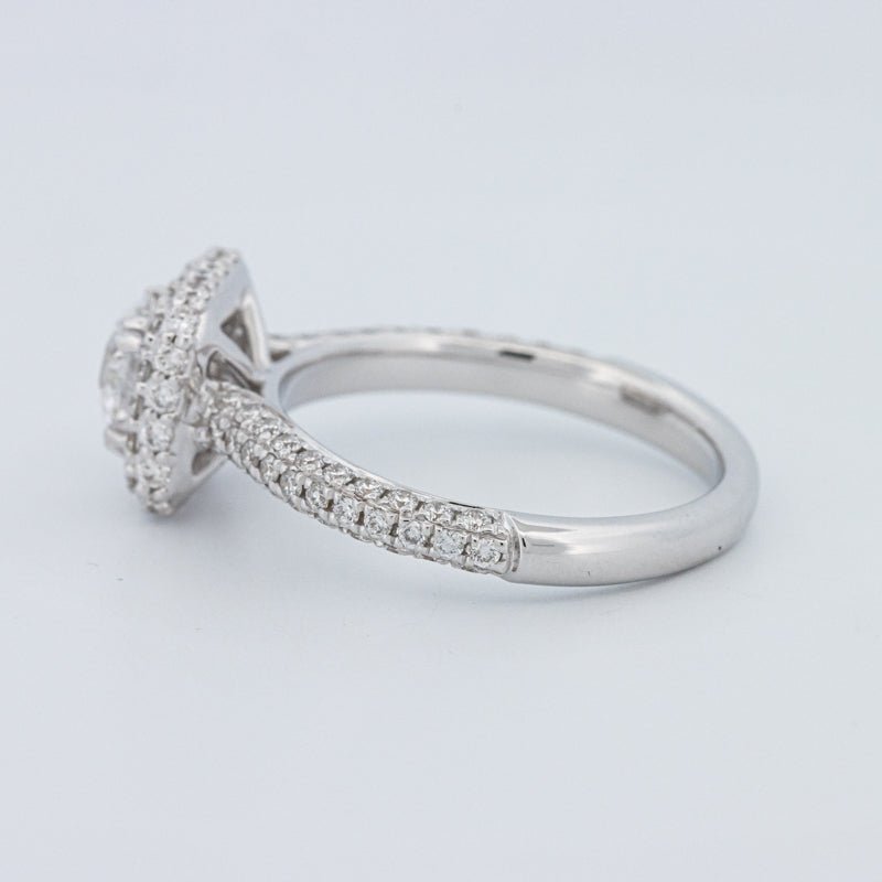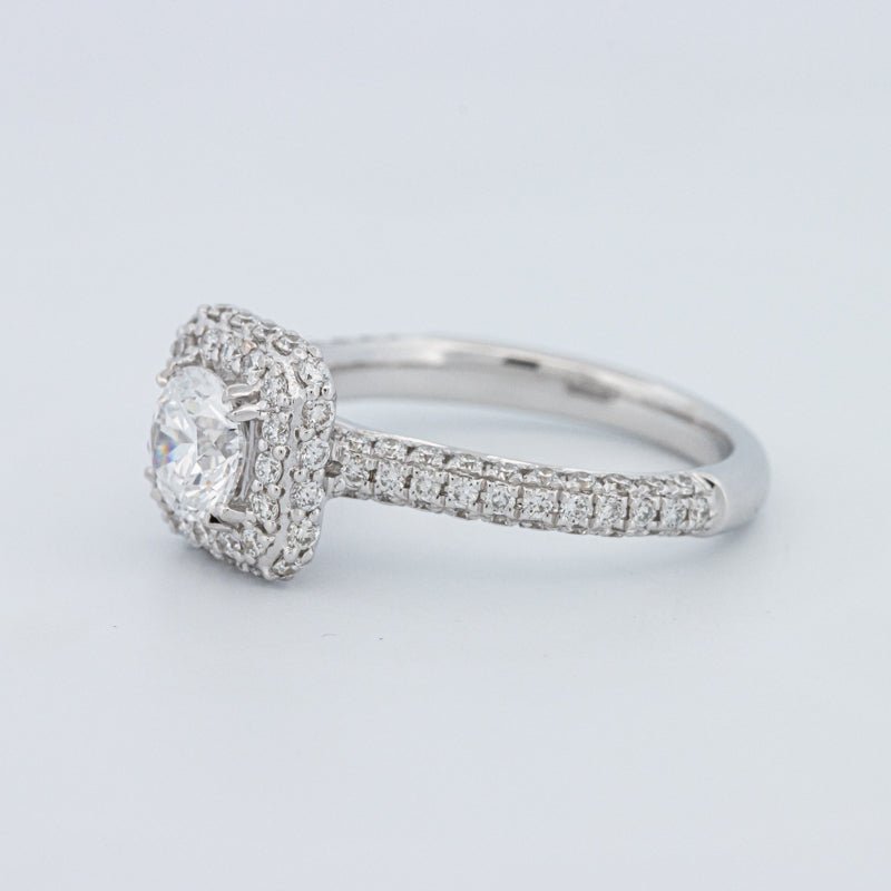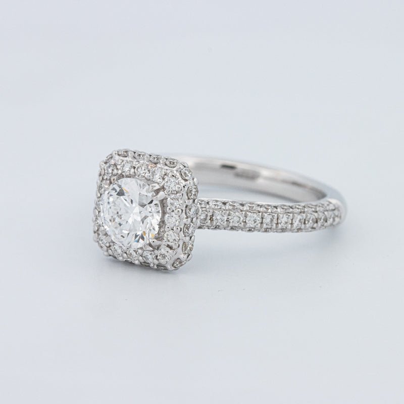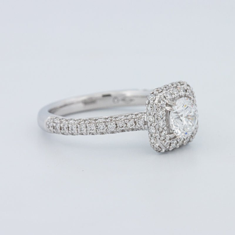Um brilhante redondo de 0.73 ct lab‑grown em D/VVS está inserido num halo pavé quadrado, realçando o tamanho e emoldurando o centro com um brilho estruturado.