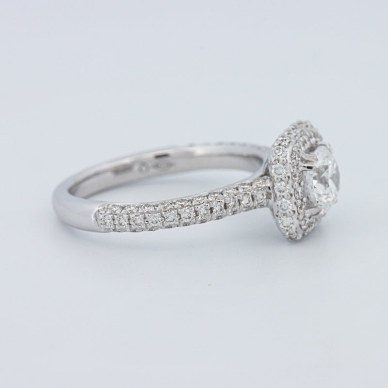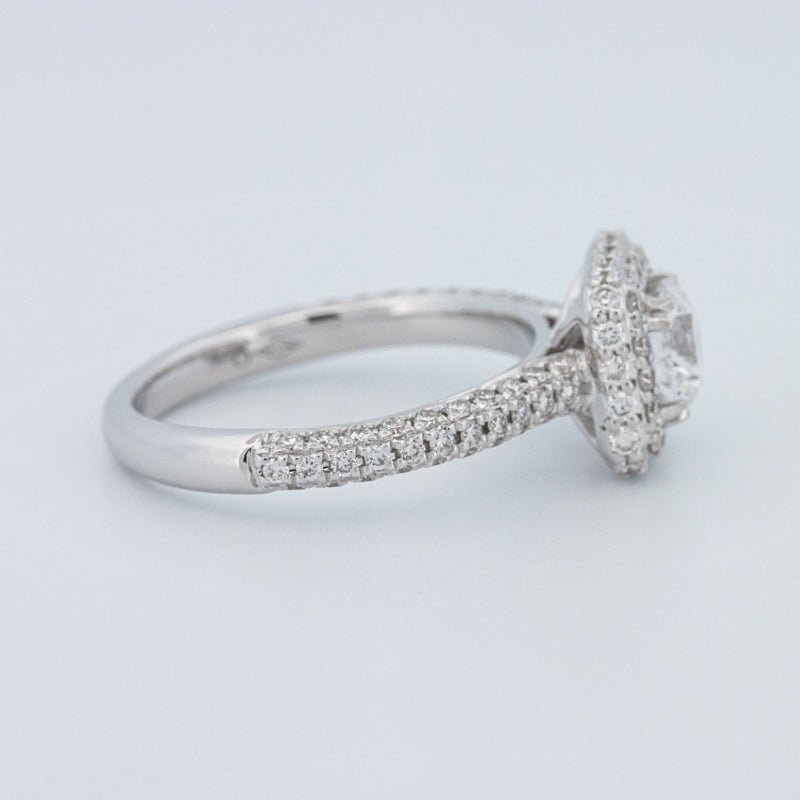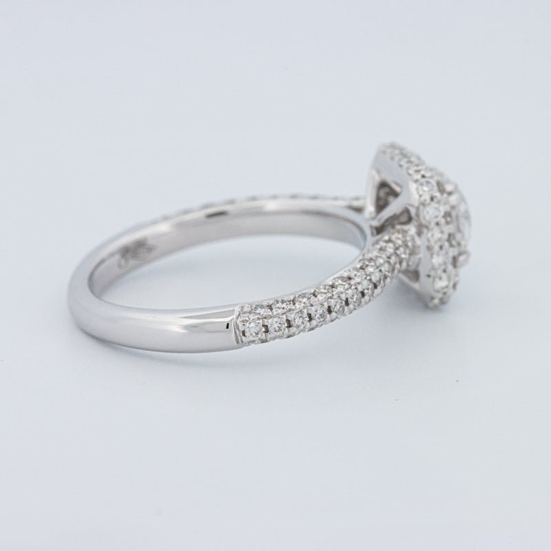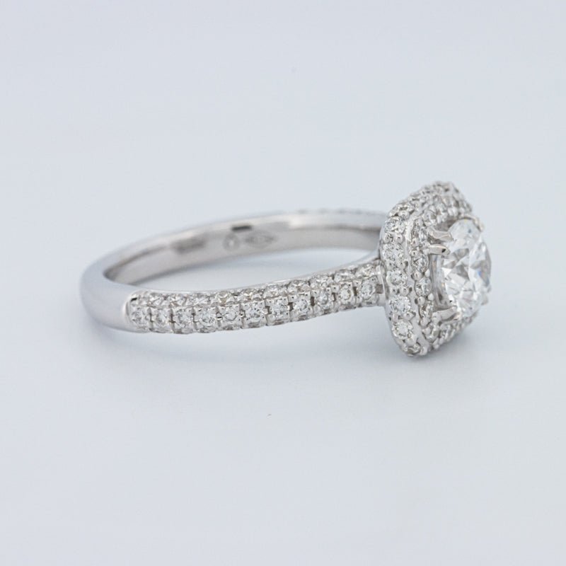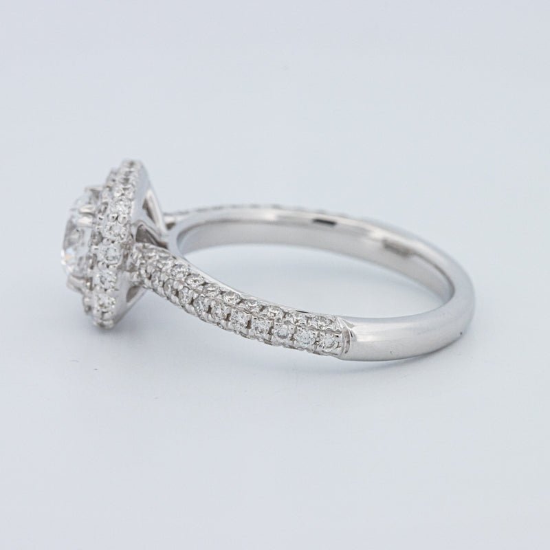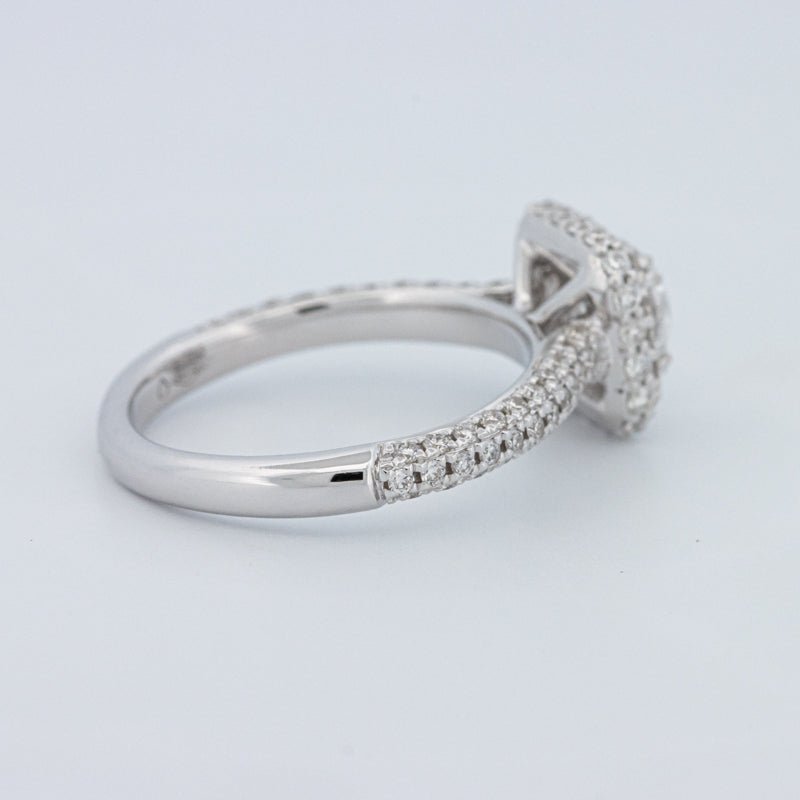 Um brilhante redondo de 0.73 ct lab‑grown em D/VVS está inserido num halo pavé quadrado, realçando o tamanho e emoldurando o centro com um brilho estruturado.