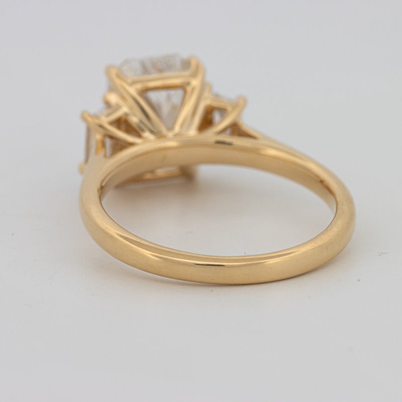 “Ayala” centra um corte radiant de 2.50 ct lab grown certificado IGI em cor E–F e pureza VS1–VS2 para um brilho nítido e simetria moderna.