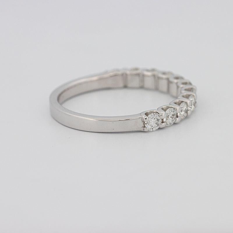 Realizat din aur alb de 18K cu un profil de 2.70 mm, acest inel de semieternitate echilibrează confortul și eleganța atemporală.