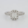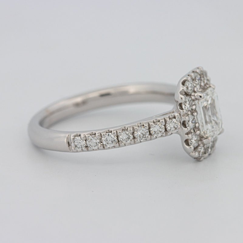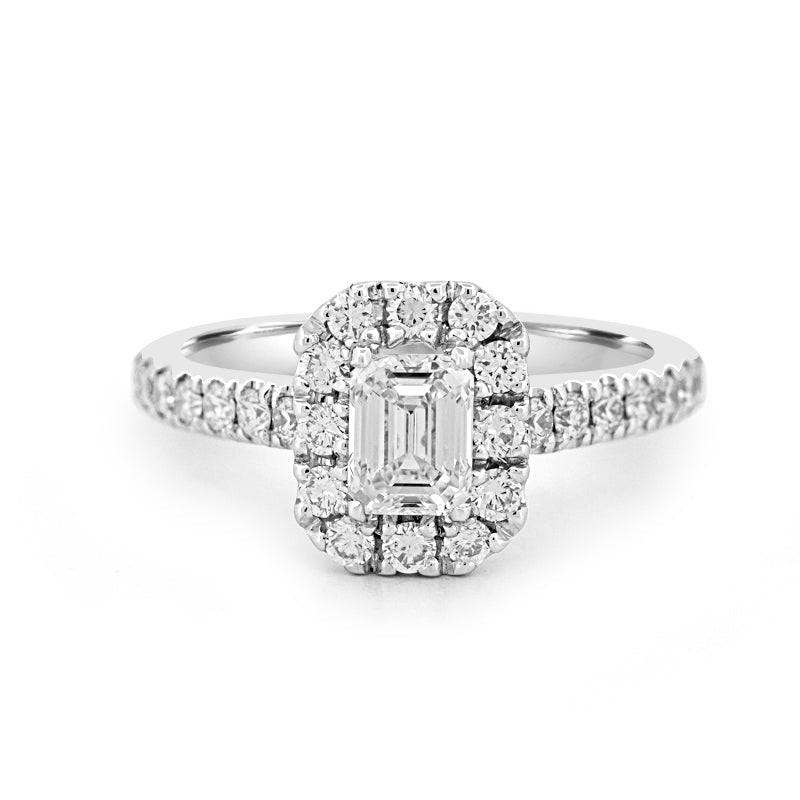 Un centru de 0.72 ct E/VVS2 tăiat emerald, certificat GIA, este încadrat de un halo luminos, îmbinând geometria clară cu strălucirea rafinată.