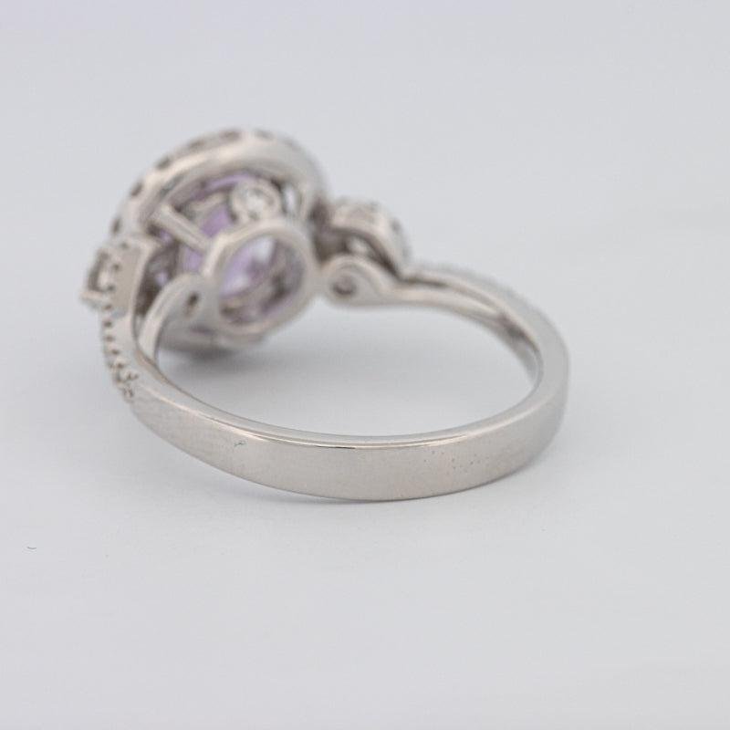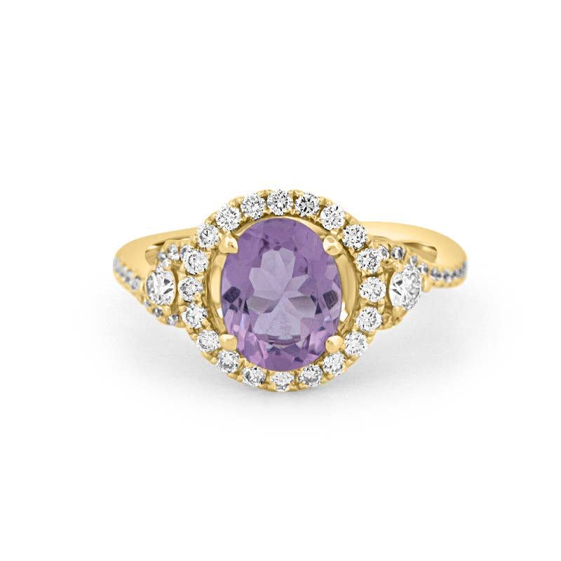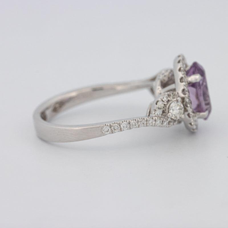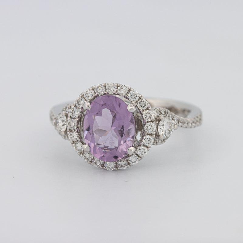 Un ametist rotund viu de 2.01 ct este încadrat de un halo strălucitor de diamante F/VS, totalizând 1.08 ct, pentru o culoare saturată și o strălucire rafinată.