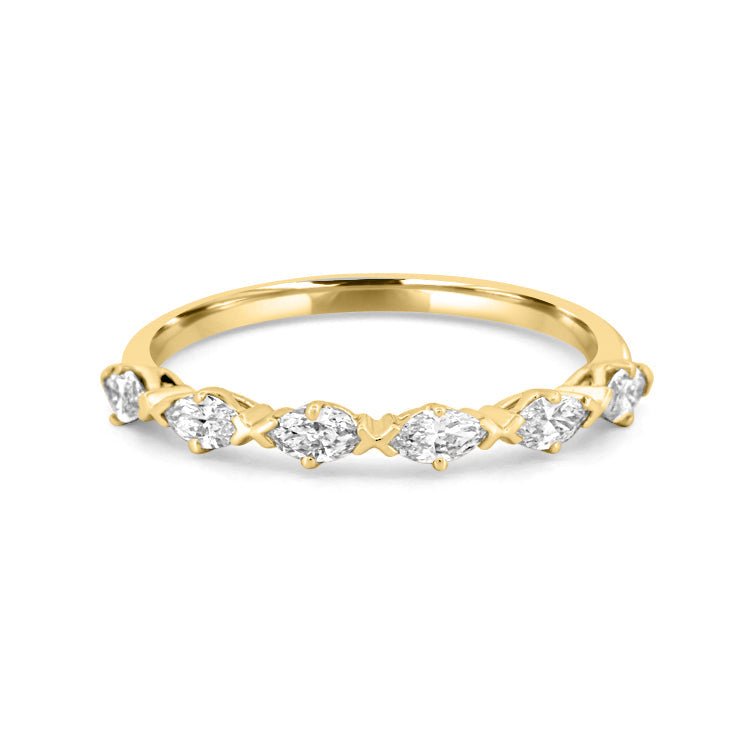 O bandă rafinată de jumătate de eternitate, setată cu 0.50 ct de diamante marquise lab‑grown, de culoare F strălucitoare și claritate VS, pentru o strălucire alungită și elegantă pe deget.