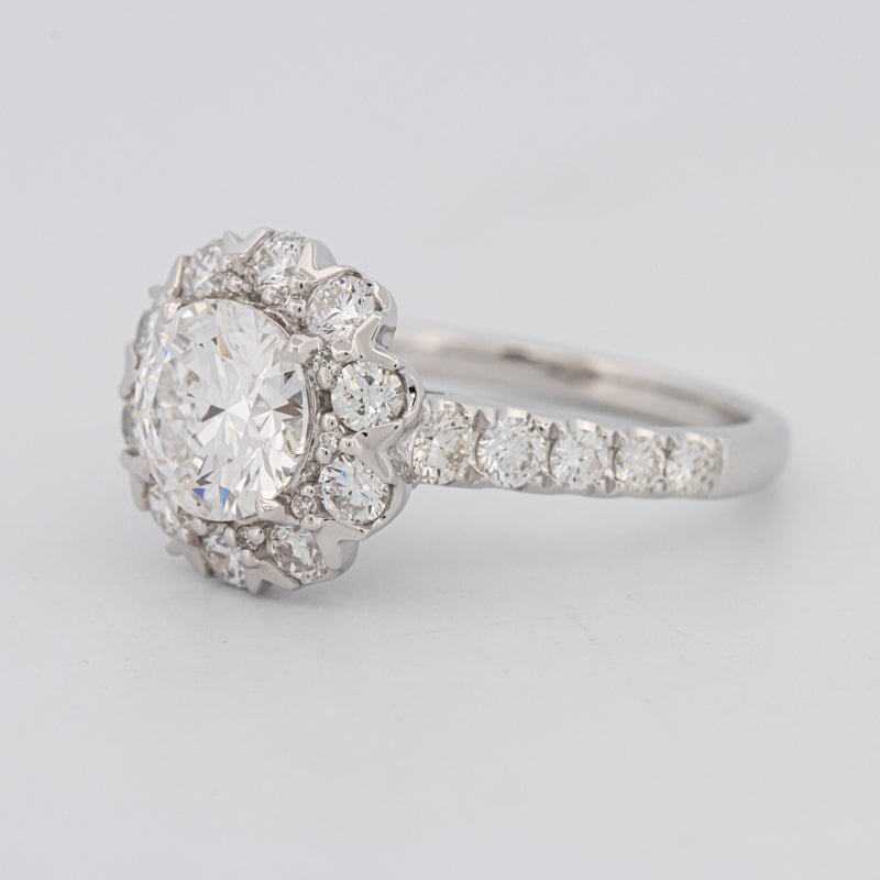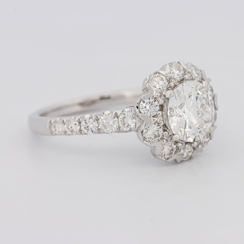 O capodoperă atemporală care combină un centru de 1.50 ct IGI‑certificat lab grown round brilliant cu o culoare F luminoasă și o claritate precisă VS1 pentru un foc și o simetrie excepționale.