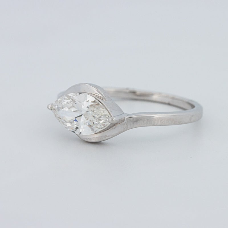 Un marquise de 1.00 ct lab‑grown în culoare E–F și claritate VVS2–VS1 aduce o strălucire alungită și un profil care alungește degetul acestui solitar minimalist.