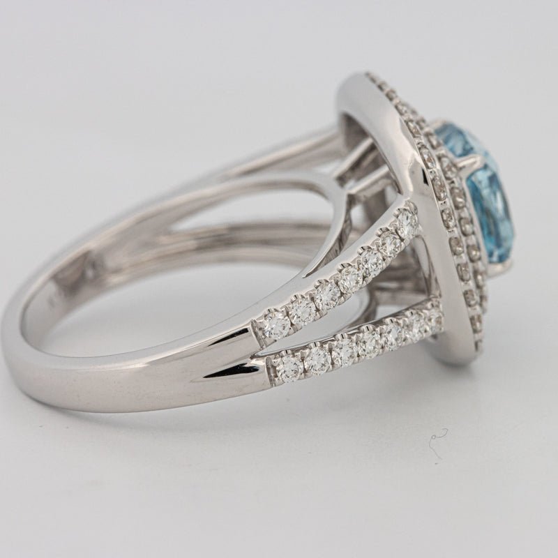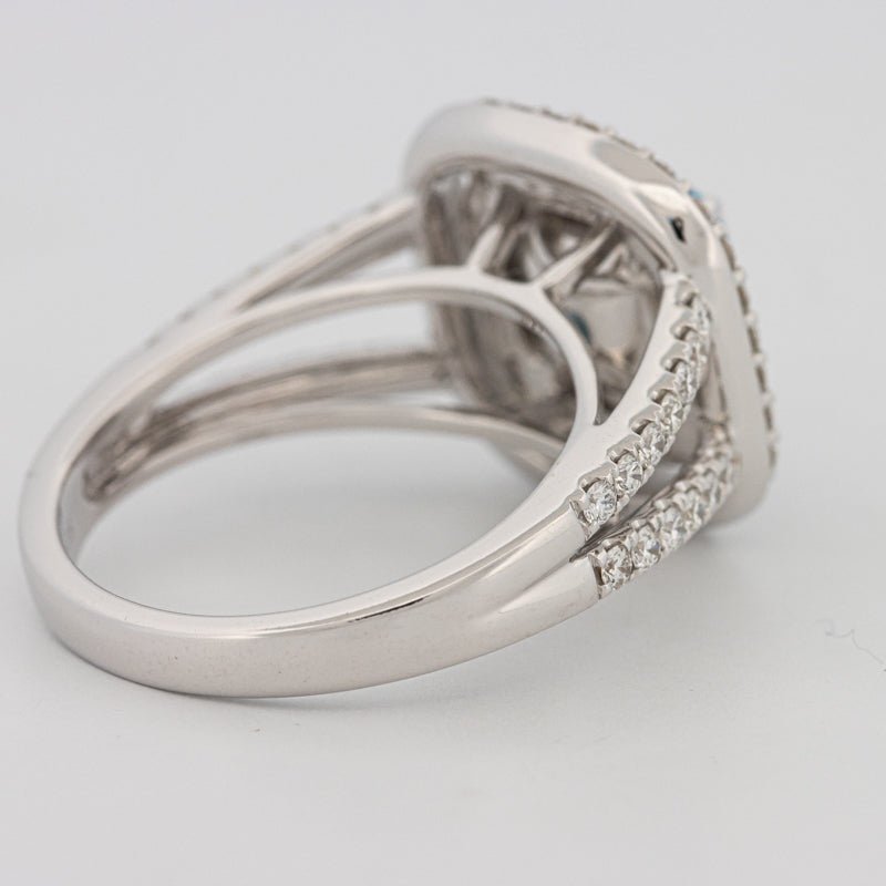 Un centru impresionant Fancy Vivid Greenish Blue lab‑grown cushion este încadrat de un halo strălucitor de diamante și o bandă pavé pentru un accent maxim pe culoare și scintilație.